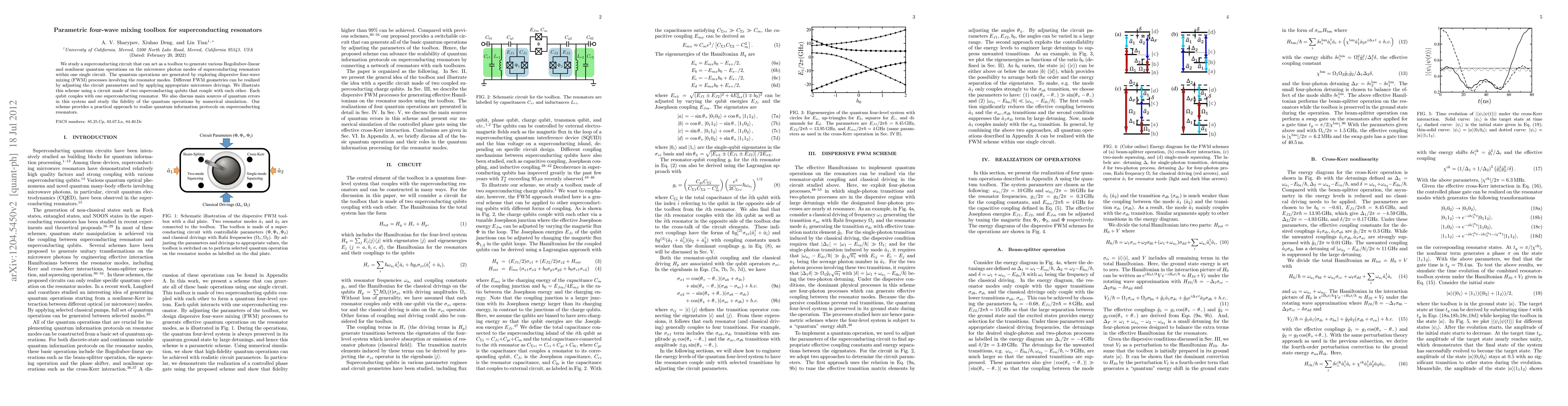 We study a superconducting circuit that can act as a toolbox to generate various Bogoliubov-linear and nonlinear quantum operations on the microwave photon modes of superconducting resonators within one single circuit. The quantum operations are generated by exploring dispersive four-wave mixing (FWM) processes involving the resonator modes. Different FWM geometries can be realized by adjusting the circuit parameters and by applying appropriate microwave drivings. We illustrate this scheme using a circuit made of two superconducting qubits that couple with each other. Each qubit couples with one superconducting resonator. We also discuss main quantum errors in this scheme and study the fidelity of the quantum operations by numerical simulation. Our scheme provides a practical approach to realize quantum information protocols on superconducting resonators.