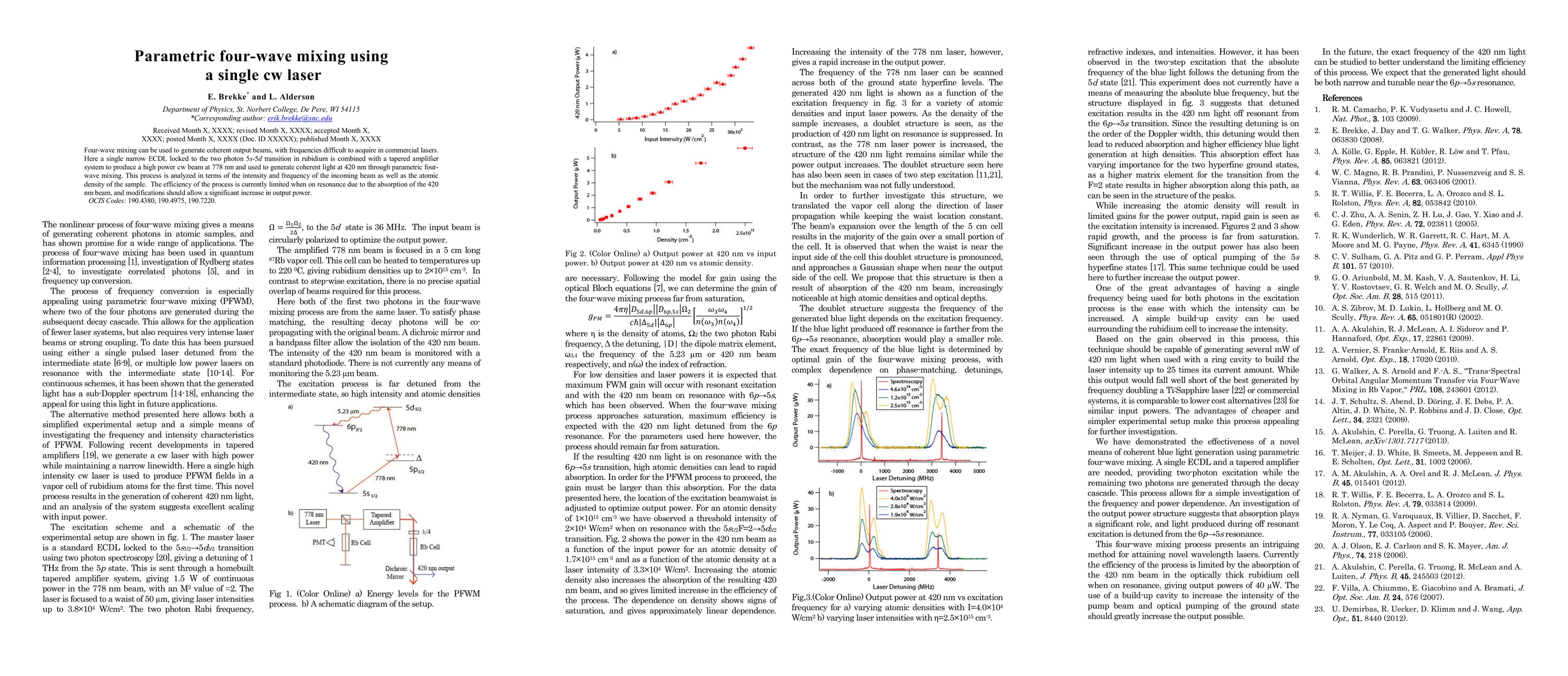 This paper explores parametric four-wave mixing using a single continuous wave laser to generate coherent light at 420 nm from a 778 nm beam. The efficiency is currently limited by absorption, but potential modifications could significantly boost output power.