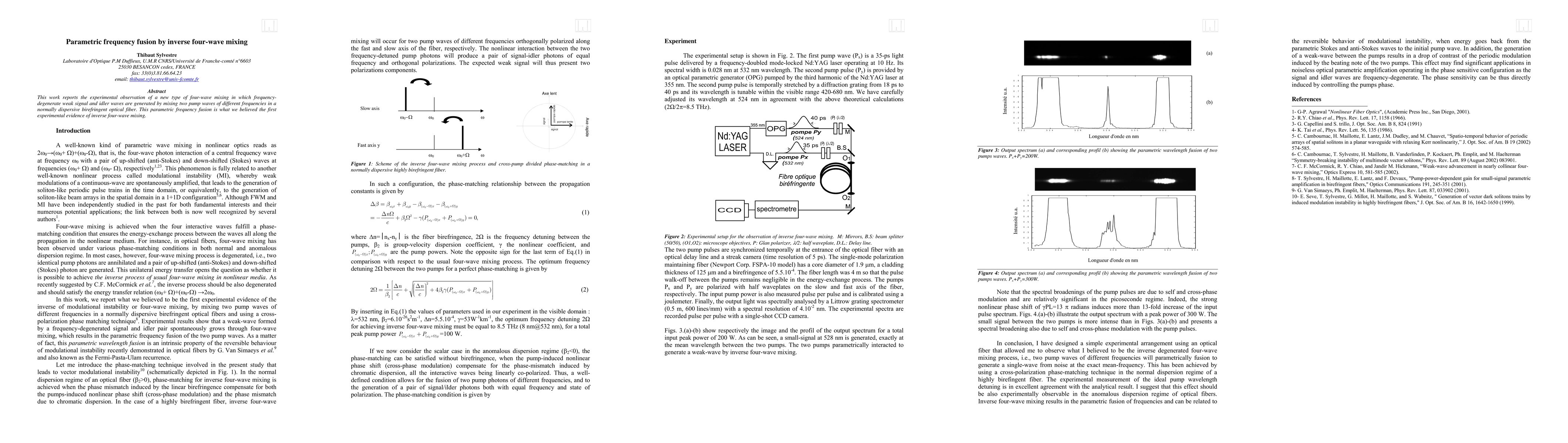 This research demonstrates the first experimental observation of inverse four-wave mixing in a birefringent optical fiber, generating frequency-degenerate weak signal and idler waves from the interaction of two different frequency pump waves. This phenomenon represents a novel form of parametric frequency fusion.
