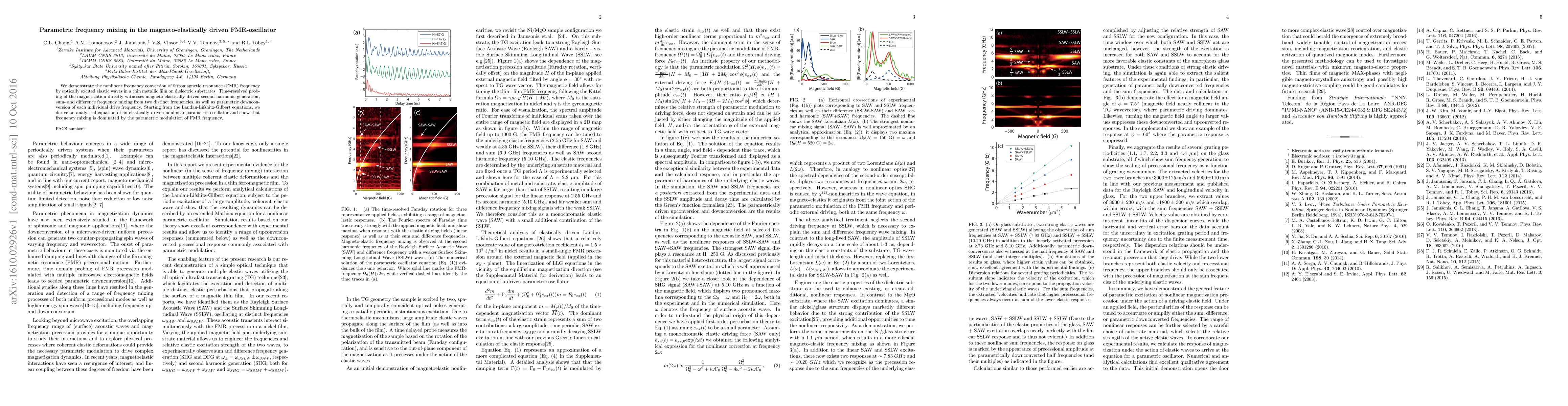 We demonstrate the nonlinear frequency conversion of ferromagnetic resonance (FMR) frequency by optically excited elastic waves in a thin metallic film on dielectric substrates. Time-resolved probing of the magnetization directly witnesses magneto-elastically driven second harmonic generation, sum- and difference frequency mixing from two distinct frequencies, as well as parametric downconversion of each individual drive frequency. Starting from the Landau-Lifshitz-Gilbert equations, we derive an analytical equation of an elastically driven nonlinear parametric oscillator and show that frequency mixing is dominated by the parametric modulation of FMR frequency.