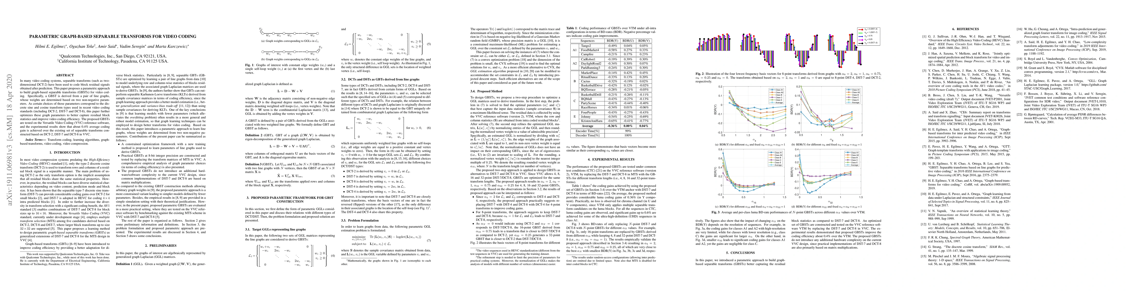 In many video coding systems, separable transforms (such as two-dimensional DCT-2) have been used to code block residual signals obtained after prediction. This paper proposes a parametric approach to build graph-based separable transforms (GBSTs) for video coding. Specifically, a GBST is derived from a pair of line graphs, whose weights are determined based on two non-negative parameters. As certain choices of those parameters correspond to the discrete sine and cosine transform types used in recent video coding standards (including DCT-2, DST-7 and DCT-8), this paper further optimizes these graph parameters to better capture residual block statistics and improve video coding efficiency. The proposed GBSTs are tested on the Versatile Video Coding (VVC) reference software, and the experimental results show that about 0.4% average coding gain is achieved over the existing set of separable transforms constructed based on DCT-2, DST-7 and DCT-8 in VVC.