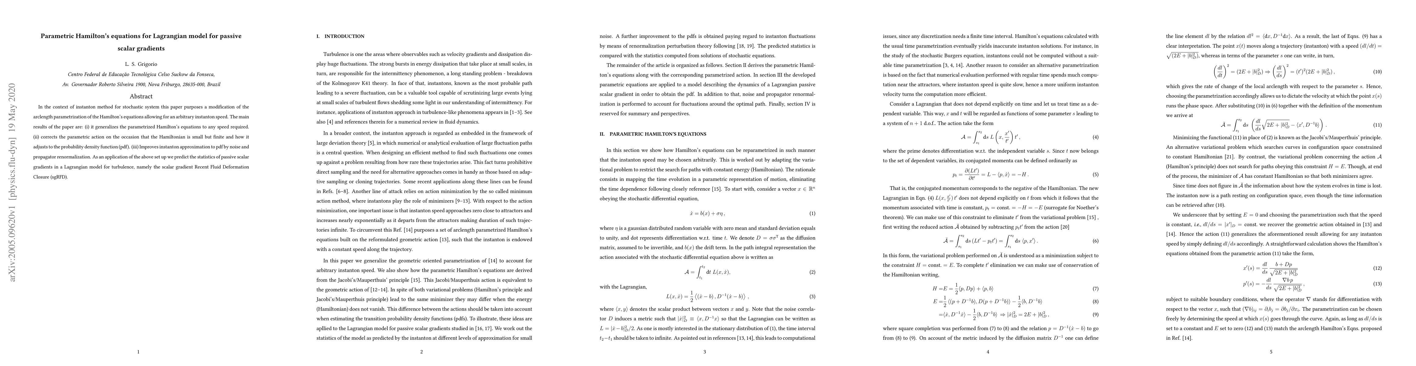 This paper modifies Hamilton's equations for Lagrangian models of passive scalar gradients, introducing a new parametric arclength that accommodates any instanton speed. It also corrects the parametric action for small but finite Hamiltonians and improves the instanton approximation, predicting the statistics of scalar gradients in turbulence.