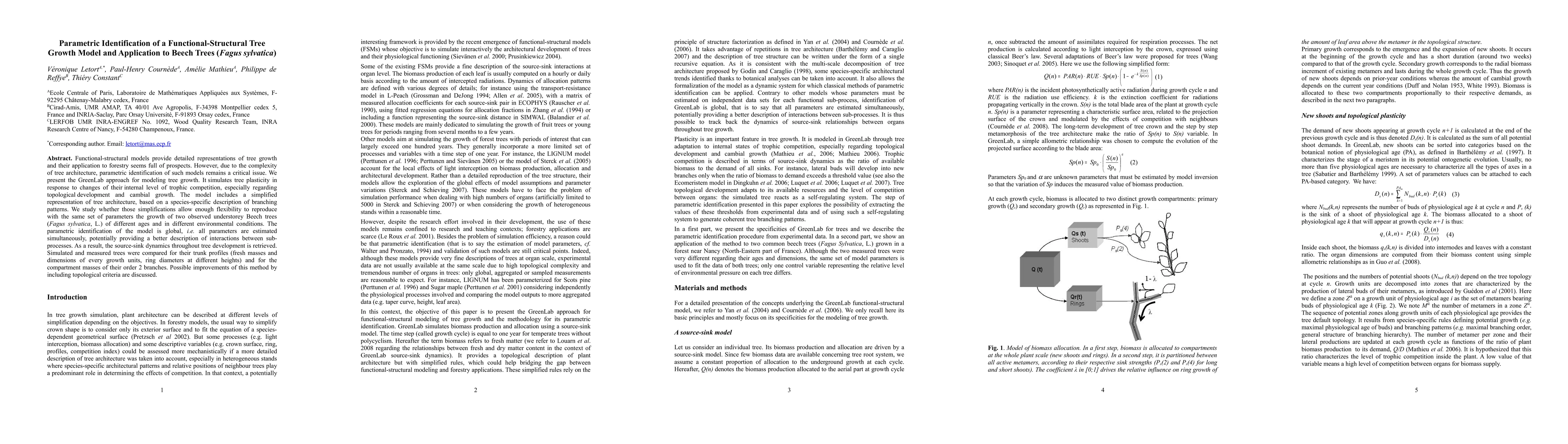Functional-structural models provide detailed representations of tree growth and their application to forestry seems full of prospects. However, owing to the complexity of tree architecture, parametric identification of such models remains a critical issue. We present the GreenLab approach for modelling tree growth. It simulates tree growth plasticity in response to changes of their internal level of trophic competition, especially topological development and cambial growth. The model includes a simplified representation of tree architecture, based on a species-specific description of branching patterns. We study whether those simplifications allow enough flexibility to reproduce with the same set of parameters the growth of two observed understorey beech trees (Fagus sylvatica L.) of different ages in different environmental conditions. The parametric identification of the model is global, i.e. all parameters are estimated simultaneously, potentially providing a better description of interactions between sub-processes. As a result, the source-sink dynamics throughout tree development is retrieved. Simulated and measured trees were compared for their trunk profiles (fresh masses and dimensions of every growth units, ring diameters at different heights) and compartment masses of their order 2 branches. Possible improvements of this method by including topological criteria are discussed.