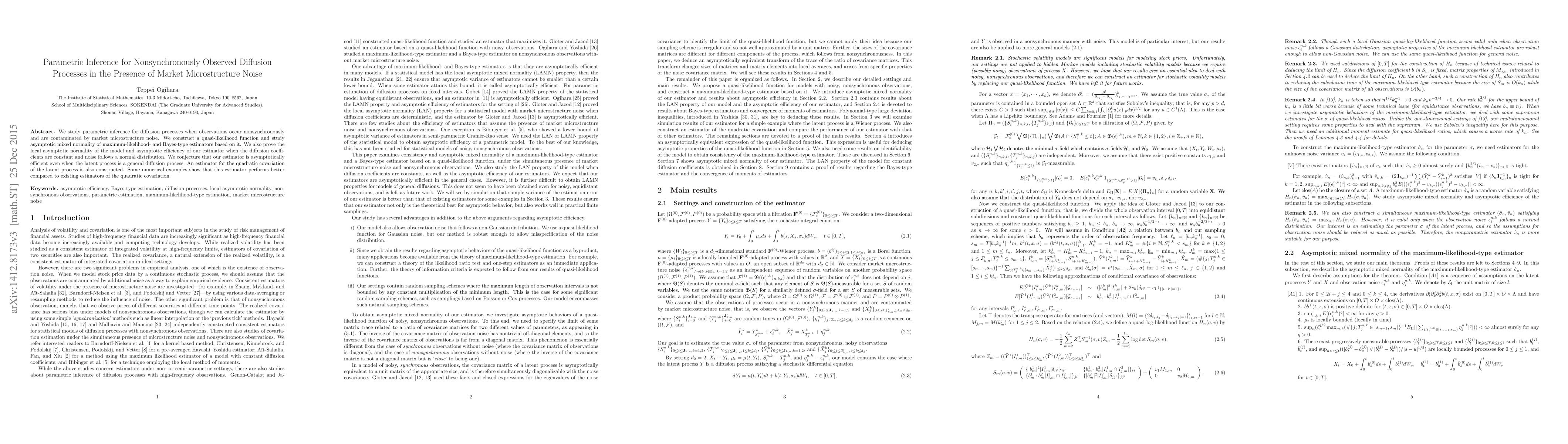 We study parametric inference for diffusion processes when observations occur nonsynchronously and are contaminated by market microstructure noise. We construct a quasi-likelihood function and study asymptotic mixed normality of maximum-likelihood- and Bayes-type estimators based on it. We also prove the local asymptotic normality of the model and asymptotic efficiency of our estimator when the diffusion coefficients are constant and noise follows a normal distribution. We conjecture that our estimator is asymptotically efficient even when the latent process is a general diffusion process. An estimator for the quadratic covariation of the latent process is also constructed. Some numerical examples show that this estimator performs better compared to existing estimators of the quadratic covariation.