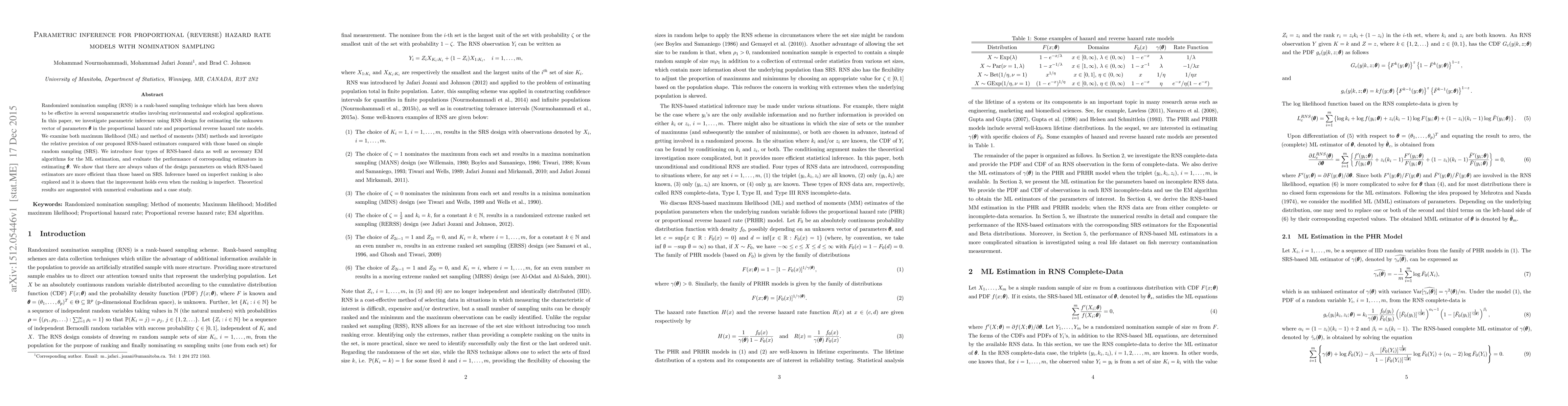 This paper explores parametric inference for proportional and reverse hazard rate models using randomized nomination sampling (RNS), comparing it to simple random sampling (SRS). The study introduces RNS-based estimators via maximum likelihood and method of moments, demonstrating their relative efficiency and robustness even under imperfect ranking.