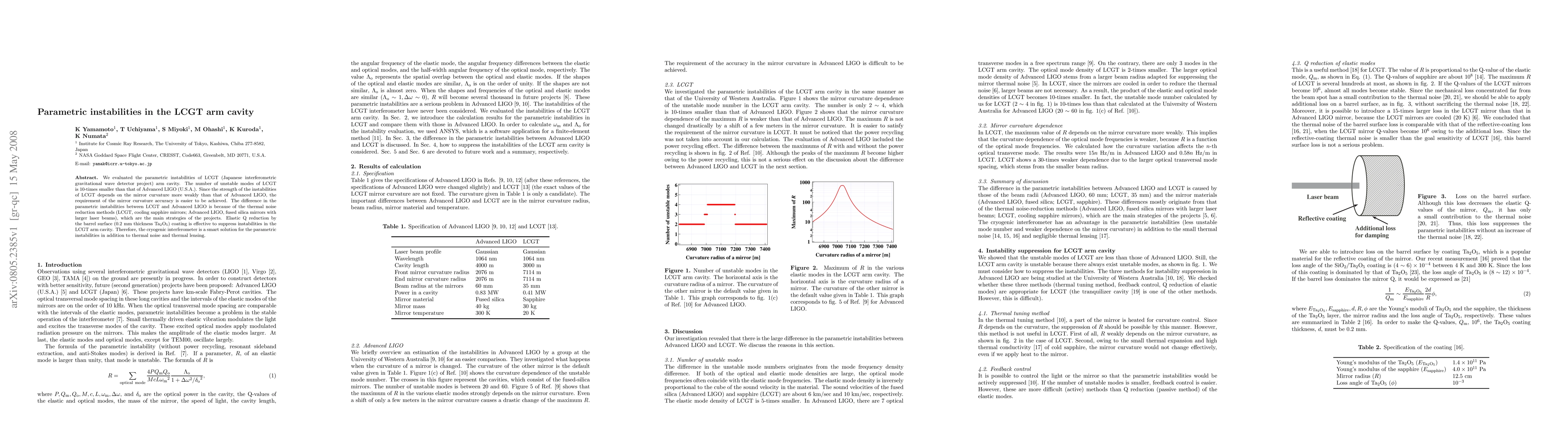 This paper evaluates the parametric instabilities in the LCGT arm cavity, finding that LCGT has 10 times fewer unstable modes compared to Advanced LIGO due to more effective thermal noise reduction methods. The use of cooled sapphire mirrors in LCGT helps achieve better mirror curvature accuracy and suppresses instabilities effectively.