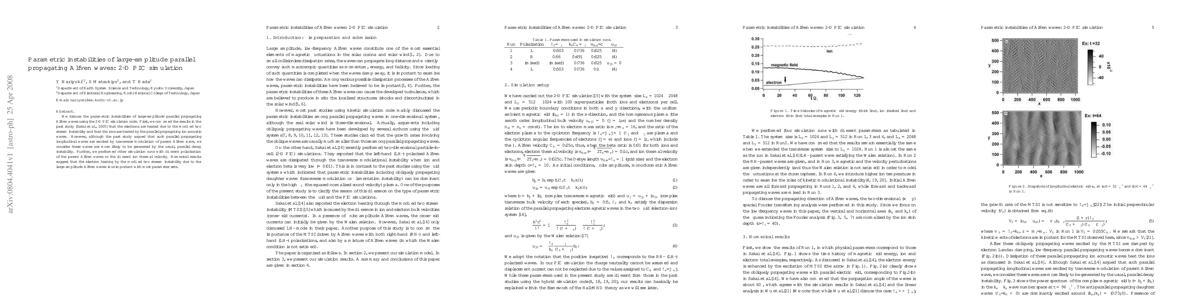 This paper uses 2-D PIC simulations to study parametric instabilities of large-amplitude parallel Alfven waves, confirming electron heating via modified two-stream instability and ion heating via parallel ion acoustic waves. It disputes previous claims about the generation mechanism of parallel propagating longitudinal waves, suggesting instead that the usual parallel decay instability is responsible.