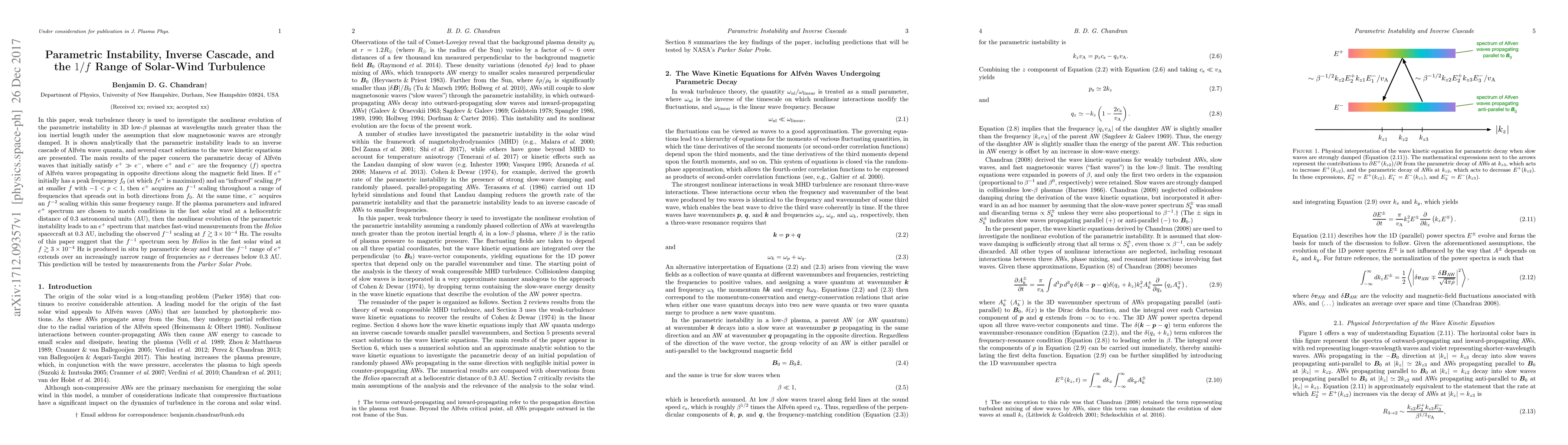 Researchers found that parametric instability in solar wind turbulence leads to an inverse cascade of Alfvén wave quanta, producing a $1/f$ spectrum that matches fast-wind measurements from the Helios spacecraft at 0.3 AU.