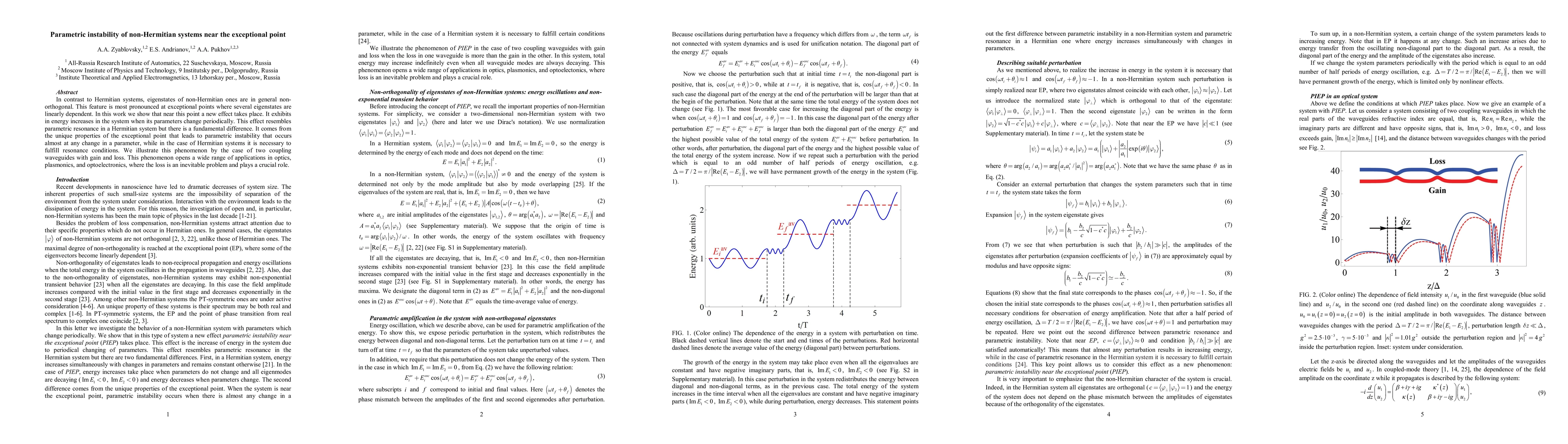 In contrast to Hermitian systems, eigenstates of non-Hermitian ones are in general nonorthogonal. This feature is most pronounced at exceptional points where several eigenstates are linearly dependent. In this work we show that near this point a new effect takes place. It exhibits in energy increases in the system when its parameters change periodically. This effect resembles parametric resonance in a Hermitian system but there is a fundamental difference. It comes from the unique properties of the exceptional point that leads to parametric instability that occurs almost at any change in a parameter, while in the case of Hermitian systems it is necessary to fulfill resonance conditions. We illustrate this phenomenon by the case of two coupling waveguides with gain and loss. This phenomenon opens a wide range of applications in optics, plasmonics, and optoelectronics, where the loss is an inevitable problem and plays a crucial role.
