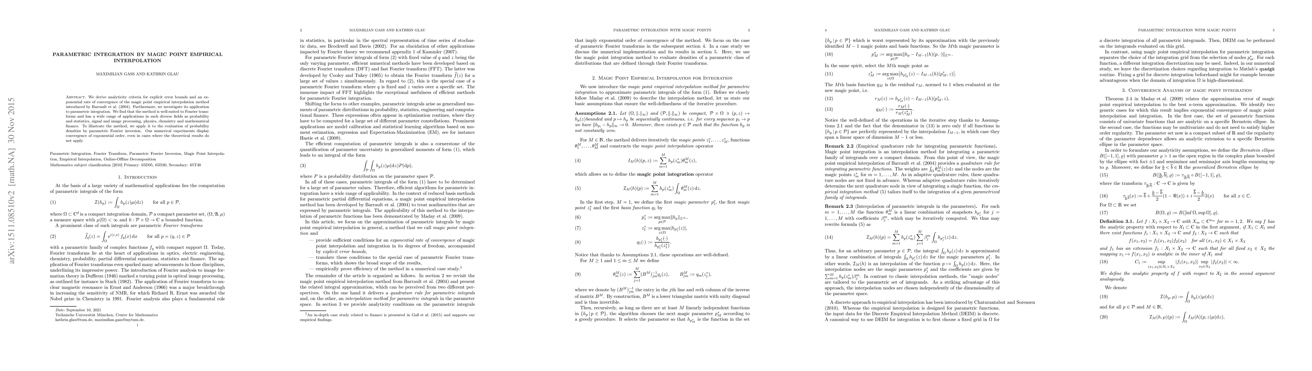 We derive analyticity criteria for explicit error bounds and an exponential rate of convergence of the magic point empirical interpolation method introduced by Barrault et al. (2004). Furthermore, we investigate its application to parametric integration. We find that the method is well-suited to Fourier transforms and has a wide range of applications in such diverse fields as probability and statistics, signal and image processing, physics, chemistry and mathematical finance. To illustrate the method, we apply it to the evaluation of probability densities by parametric Fourier inversion. Our numerical experiments display convergence of exponential order, even in cases where the theoretical results do not apply.