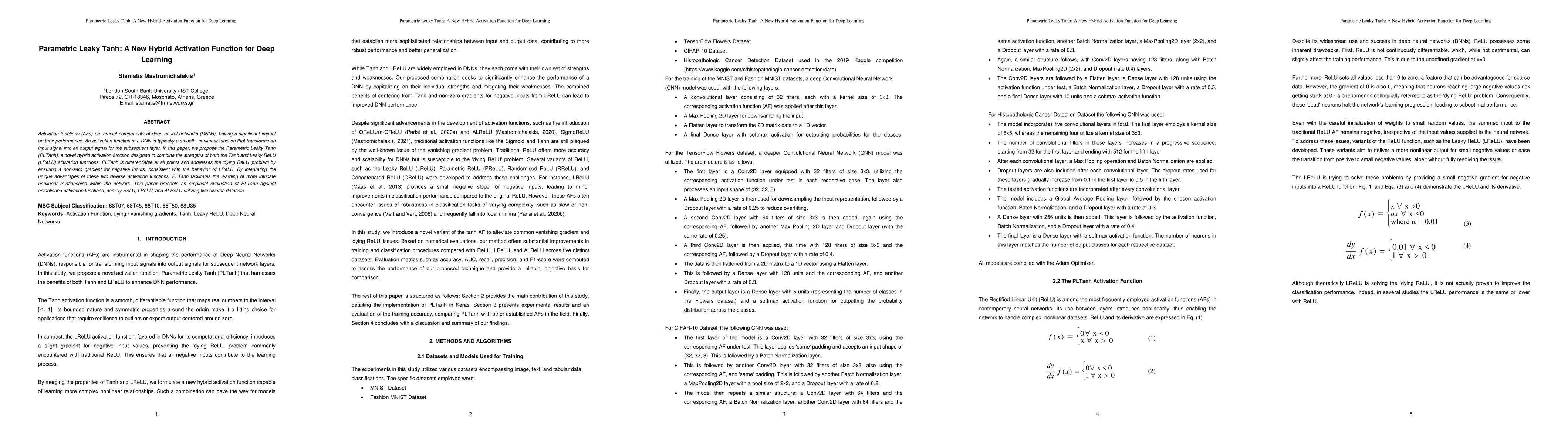 Activation functions (AFs) are crucial components of deep neural networks (DNNs), having a significant impact on their performance. An activation function in a DNN is typically a smooth, nonlinear function that transforms an input signal into an output signal for the subsequent layer. In this paper, we propose the Parametric Leaky Tanh (PLTanh), a novel hybrid activation function designed to combine the strengths of both the Tanh and Leaky ReLU (LReLU) activation functions. PLTanh is differentiable at all points and addresses the 'dying ReLU' problem by ensuring a non-zero gradient for negative inputs, consistent with the behavior of LReLU. By integrating the unique advantages of these two diverse activation functions, PLTanh facilitates the learning of more intricate nonlinear relationships within the network. This paper presents an empirical evaluation of PLTanh against established activation functions, namely ReLU, LReLU, and ALReLU utilizing five diverse datasets.