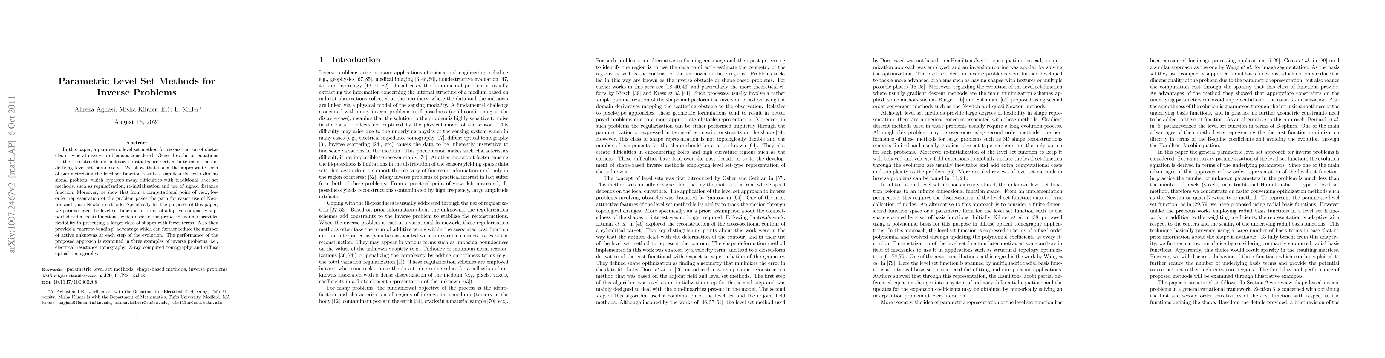 This paper introduces a parametric level set method for reconstructing obstacles in inverse problems, deriving evolution equations that simplify the problem using adaptive compactly supported radial basis functions. The approach reduces computational complexity and enhances the use of Newton and quasi-Newton methods, demonstrated through applications in electrical resistance, X-ray, and diffuse optical tomography.