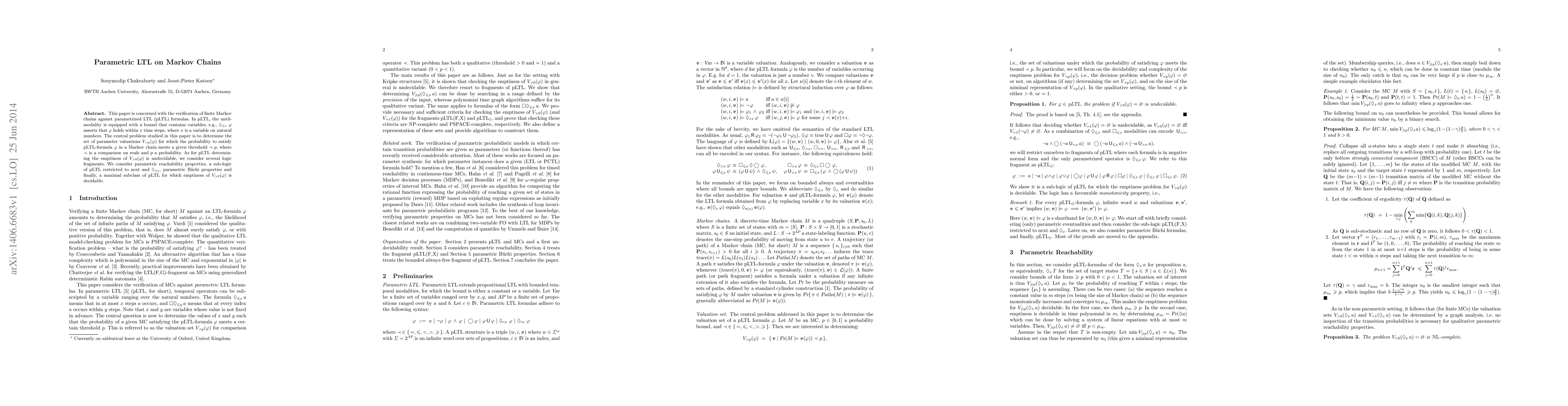 The paper studies the verification of finite Markov chains against parametric Linear Temporal Logic (LTL) formulas, focusing on the central problem of determining the set of parameter valuations for which the probability of satisfying a given pLTL formula meets a specified threshold.