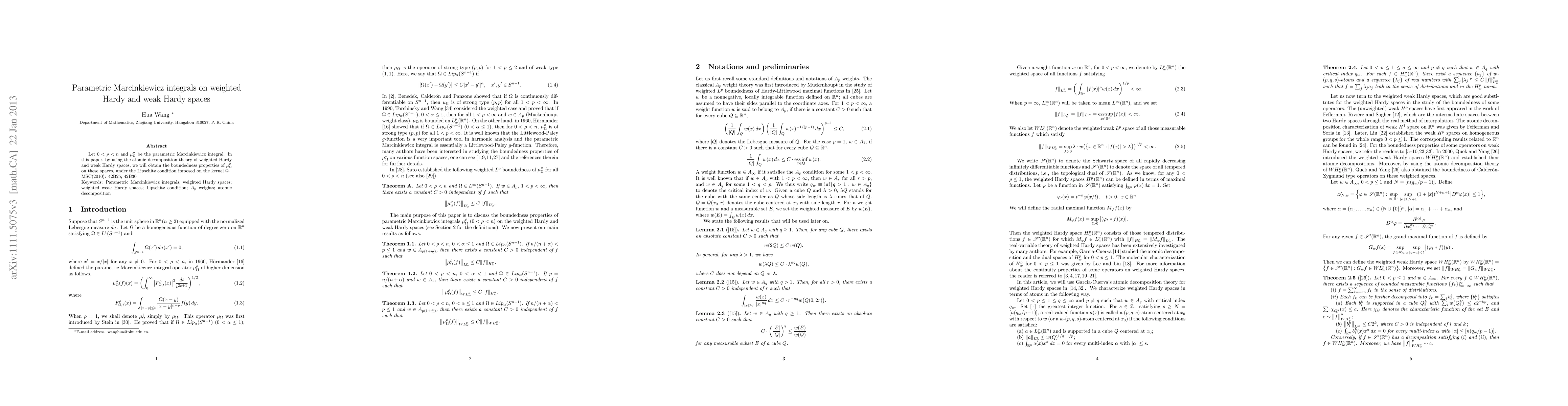 This research investigates the boundedness of parametric Marcinkiewicz integrals, $\mu^{\rho}_{\Omega}$, on weighted Hardy and weak Hardy spaces, utilizing atomic decomposition theory and imposing a Lipschitz condition on the kernel $\Omega$ to achieve these results.