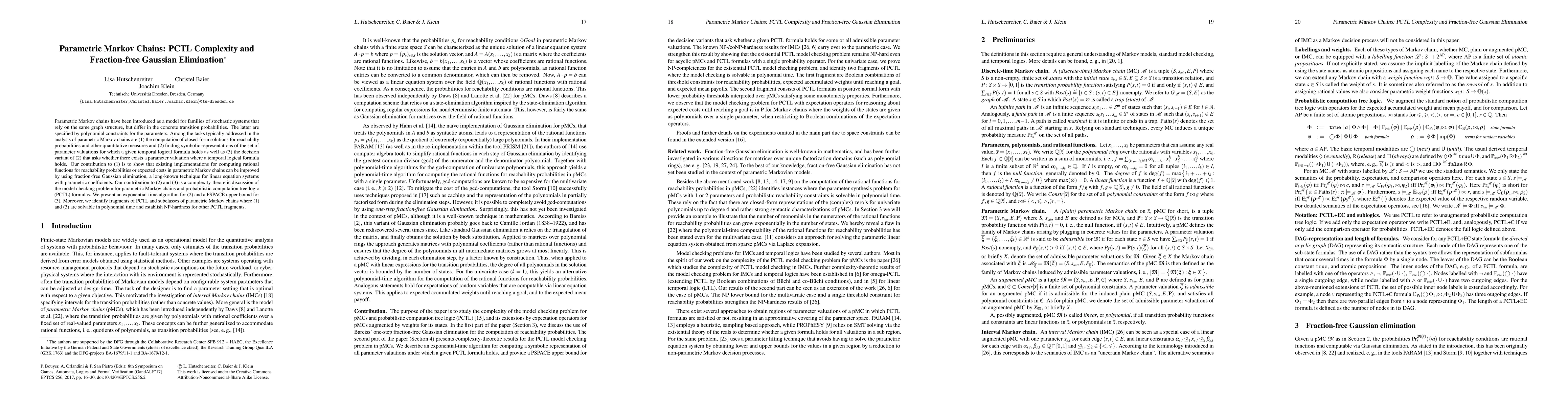This paper improves the computation of reachability probabilities in parametric Markov chains using fraction-free Gaussian elimination. It also discusses the complexity of model checking for PCTL formulas in parametric Markov chains, presenting an exponential-time algorithm and establishing PSPACE upper bounds, as well as identifying polynomial-time solvable fragments and NP-hardness for others.
