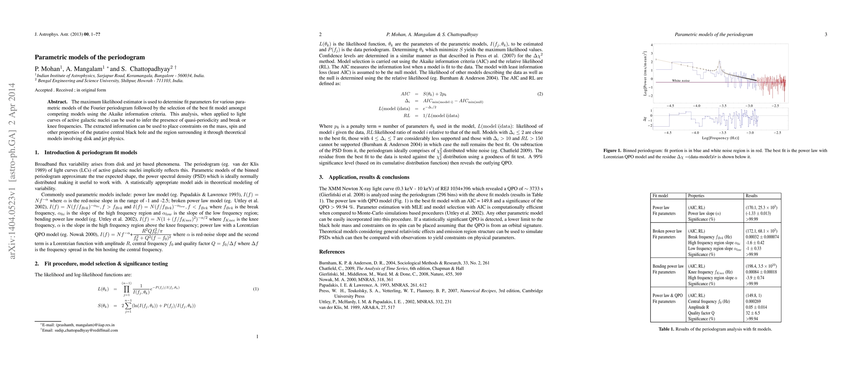 The maximum likelihood estimator is used to determine fit parameters for various parametric models of the Fourier periodogram followed by the selection of the best fit model amongst competing models using the Akaike information criteria. This analysis, when applied to light curves of active galactic nuclei can be used to infer the presence of quasi-periodicity and break or knee frequencies. The extracted information can be used to place constraints on the mass, spin and other properties of the putative central black hole and the region surrounding it through theoretical models involving disk and jet physics.