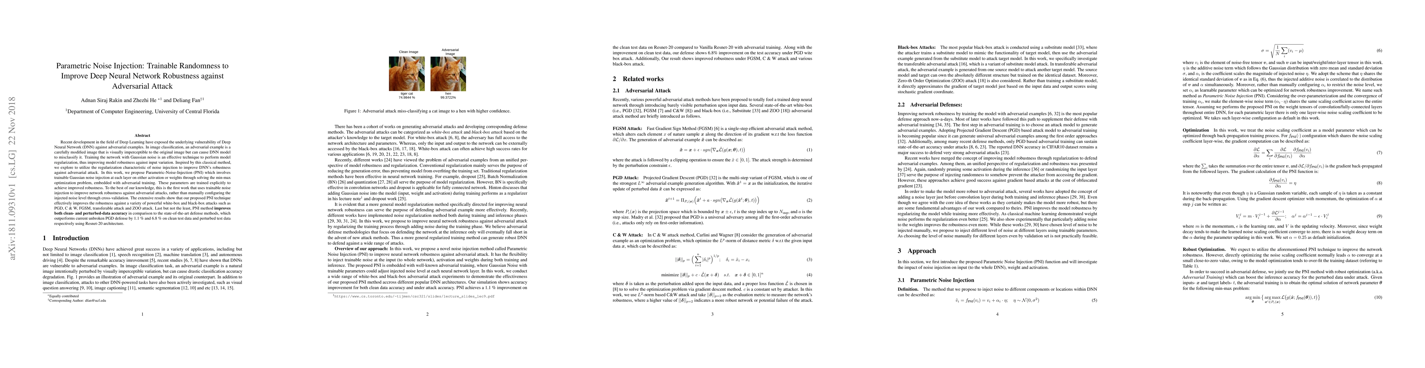 This paper proposes Parametric-Noise-Injection (PNI), a novel method involving trainable Gaussian noise to enhance Deep Neural Network (DNN) robustness against adversarial attacks. Unlike traditional noise methods, PNI directly trains noise parameters to optimize model robustness, leading to superior performance against various attack types and improved accuracy on clean and perturbed data.