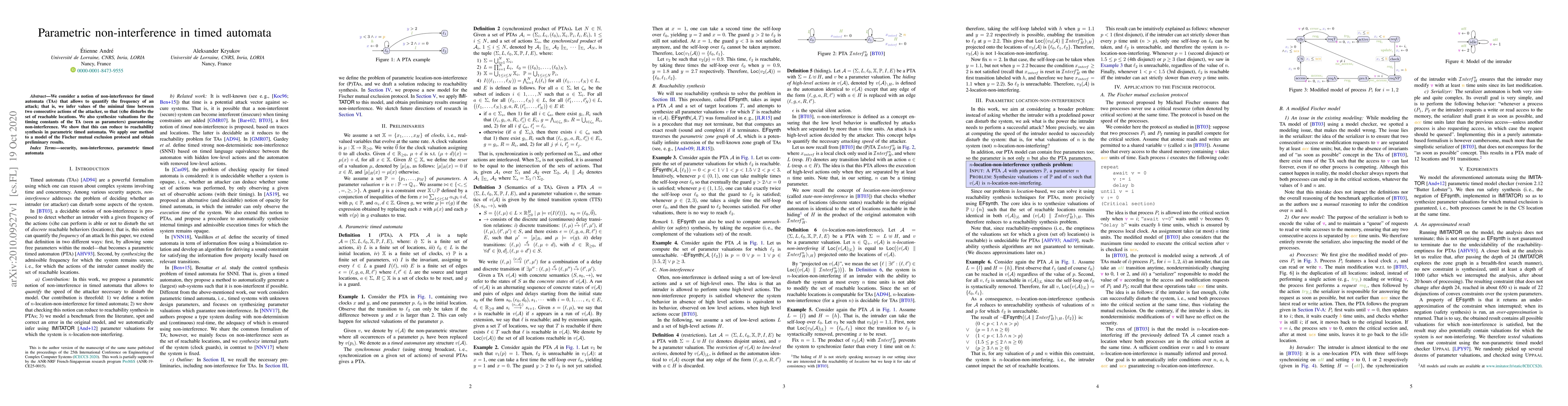This paper introduces a parametric non-interference notion for timed automata, enabling the quantification of attack frequency and synthesis of timing constant valuations to ensure non-interference. Preliminary results from applying the method to the Fischer mutual exclusion protocol are presented.