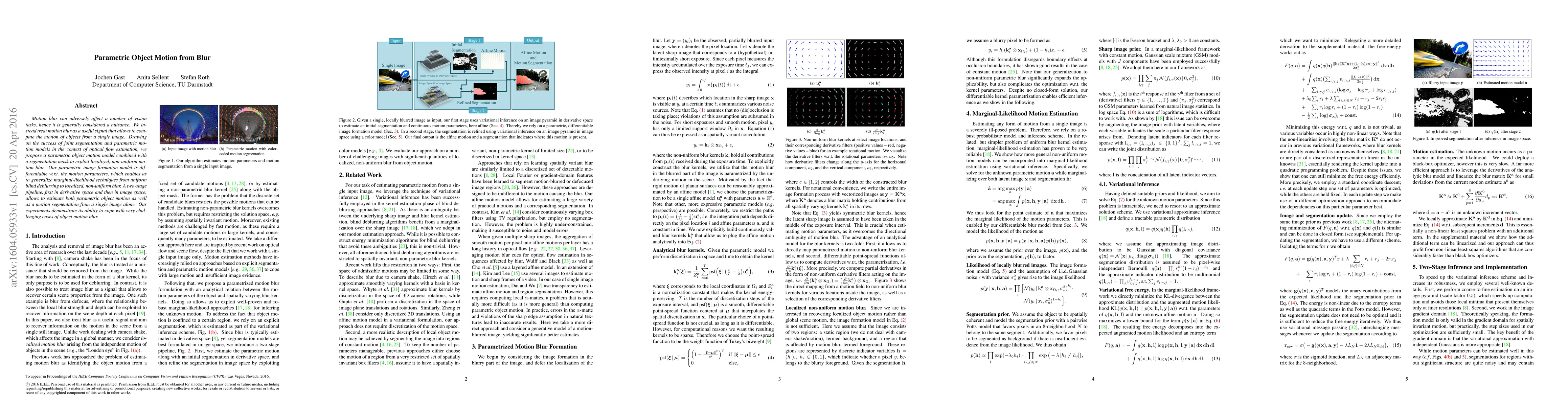 This paper proposes a parametric object motion model to extract motion information from a single blurred image, leveraging localized, non-uniform blur. It uses a differentiable image formation model and a two-stage pipeline to estimate both object motion and segmentation, demonstrating effectiveness in challenging blur scenarios.