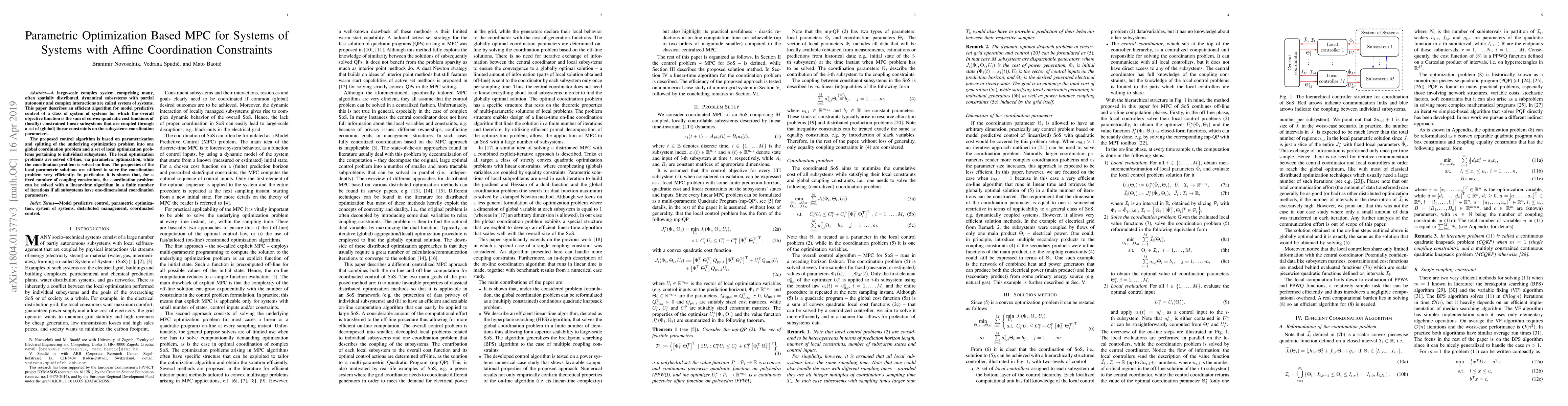 This paper proposes a parametric optimization-based model predictive control (MPC) algorithm for system of systems with affine coordination constraints. The algorithm splits the optimization problem into local and global parts, solving the local optimizations offline and the coordination problem online, achieving linear-time complexity for a fixed number of coupling constraints when coordination parameters are one-dimensional.
