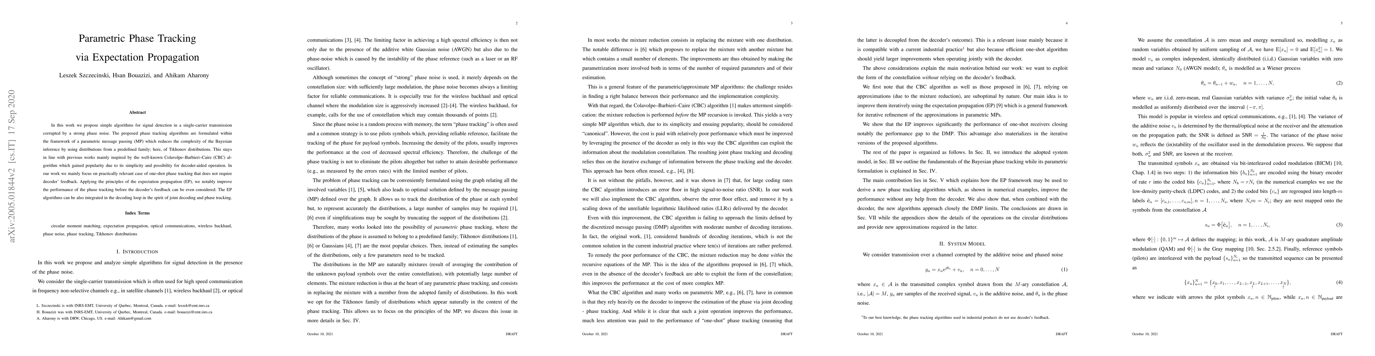 A new algorithm for single-carrier transmission signal detection is proposed, using parametric message passing to improve phase tracking performance in the presence of phase noise. The algorithm improves tracking before decoder feedback can be considered, offering a simple solution for one-shot phase tracking.