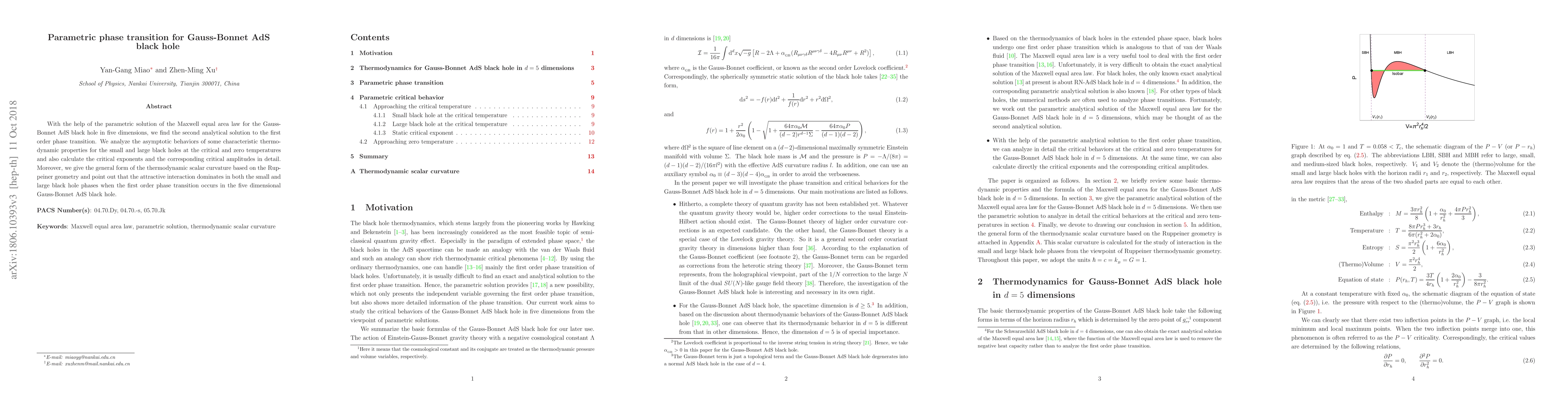This paper finds the second analytical solution for the first-order phase transition in five-dimensional Gauss-Bonnet AdS black holes using the parametric Maxwell equal area law. It analyzes thermodynamic properties and identifies attractive interactions dominating during phase transitions, while calculating critical exponents and scalar curvature in Ruppeiner geometry.