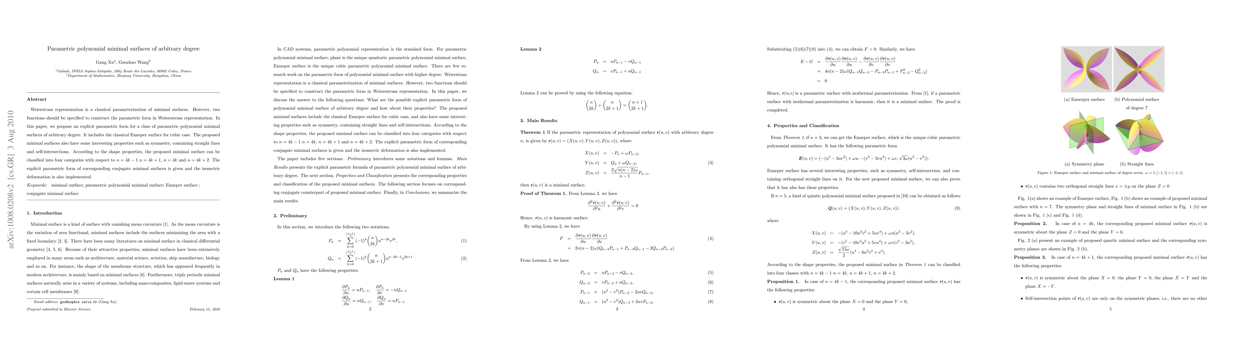 This paper proposes an explicit parametric form for polynomial minimal surfaces of arbitrary degree using Weierstrass representation, extending the classical Enneper surface. The proposed surfaces exhibit symmetry, straight lines, and self-intersections, classified into four categories based on degree $n$. The study also provides the conjugate minimal surfaces and discusses isometric deformation.