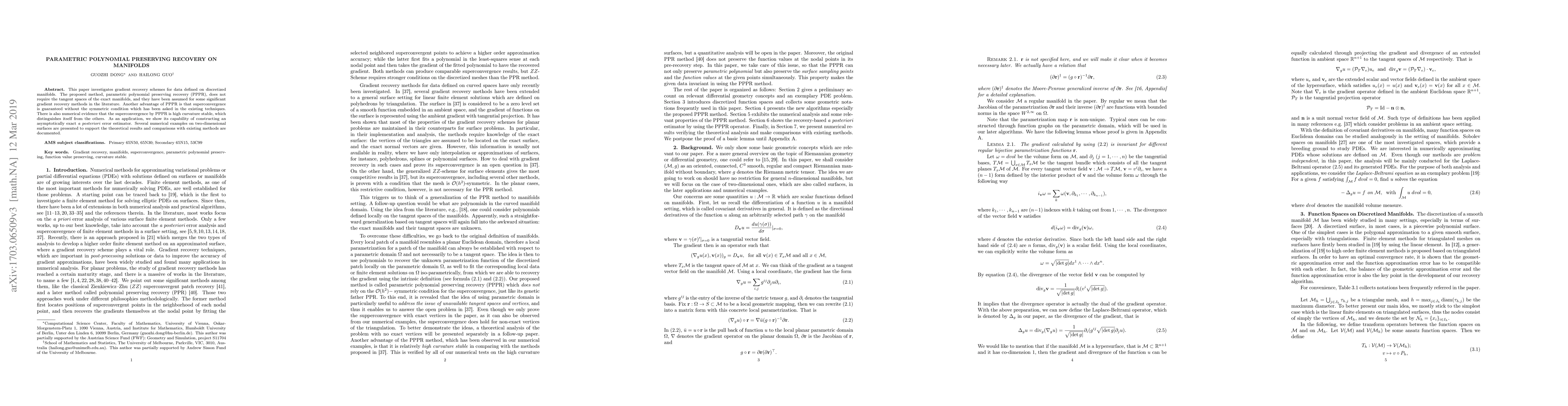 This paper investigates gradient recovery schemes for data defined on discretized manifolds. The proposed method, parametric polynomial preserving recovery (PPPR), does not require the tangent spaces of the exact manifolds, and they have been assumed for some significant gradient recovery methods in the literature. Another advantage of PPPR is that superconvergence is guaranteed without the symmetric condition which has been asked in the existing techniques. There is also numerical evidence that the superconvergence by PPPR is high curvature stable, which distinguishes itself from the others. As an application, we show its capability of constructing an asymptotically exact \textit{a posteriori} error estimator. Several numerical examples on two-dimensional surfaces are presented to support the theoretical results and comparisons with existing methods are documented.