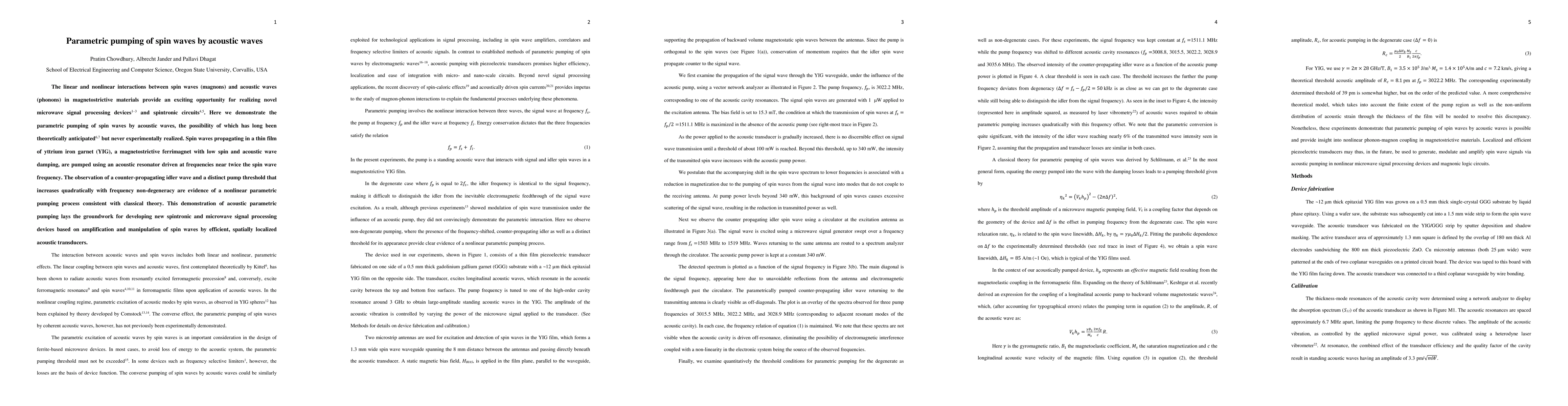 The paper presents a novel method of spin wave amplification and manipulation using acoustic parametric pumping in magnetostrictive materials, specifically YIG.