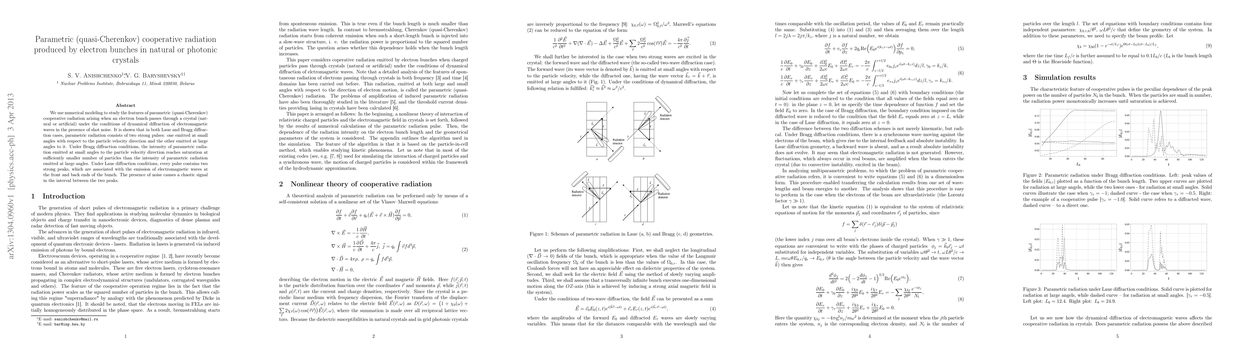 This research investigates parametric (quasi-Cherenkov) cooperative radiation generated by electron bunches passing through natural or photonic crystals, revealing two strong pulses in both Laue and Bragg diffraction scenarios. Under Bragg conditions, radiation at small angles saturates at lower particle numbers compared to large angles.