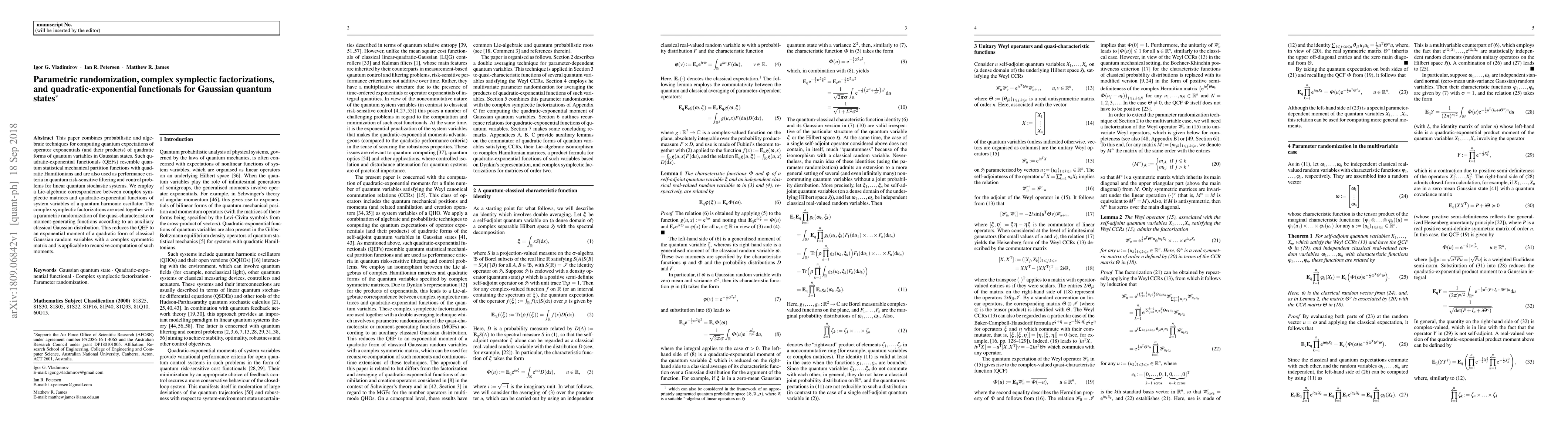 This paper uses probabilistic and algebraic methods to compute quantum expectations of operator exponentials in Gaussian quantum states, leveraging complex symplectic factorizations and parametric randomization. It applies these techniques to simplify quadratic-exponential functionals, which are relevant in quantum statistical mechanics and quantum control.