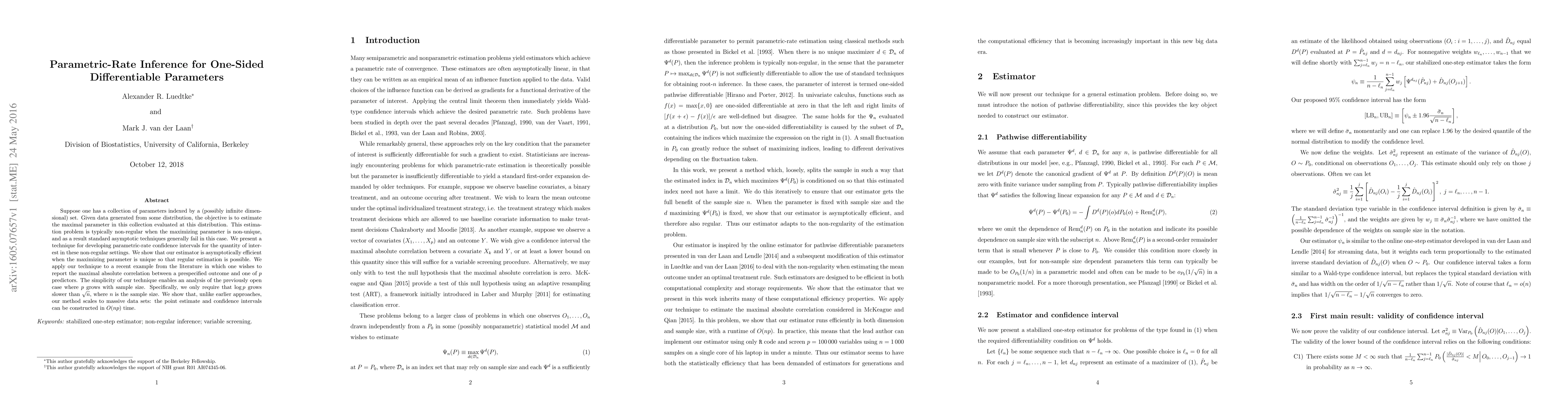 Suppose one has a collection of parameters indexed by a (possibly infinite dimensional) set. Given data generated from some distribution, the objective is to estimate the maximal parameter in this collection evaluated at this distribution. This estimation problem is typically non-regular when the maximizing parameter is non-unique, and as a result standard asymptotic techniques generally fail in this case. We present a technique for developing parametric-rate confidence intervals for the quantity of interest in these non-regular settings. We show that our estimator is asymptotically efficient when the maximizing parameter is unique so that regular estimation is possible. We apply our technique to a recent example from the literature in which one wishes to report the maximal absolute correlation between a prespecified outcome and one of p predictors. The simplicity of our technique enables an analysis of the previously open case where p grows with sample size. Specifically, we only require that log(p) grows slower than the square root of n, where n is the sample size. We show that, unlike earlier approaches, our method scales to massive data sets: the point estimate and confidence intervals can be constructed in O(np) time.