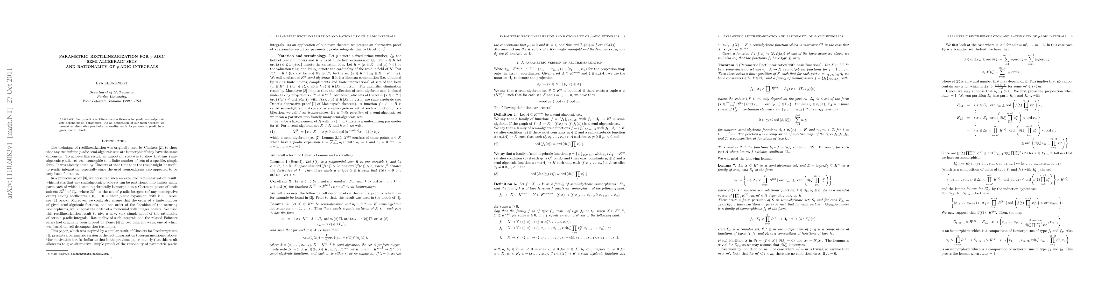 This paper establishes a rectilinearization theorem for p-adic semi-algebraic sets that vary with parameters, and uses this to provide an alternative proof of the rationality of parametric p-adic integrals, originally proven by Denef.