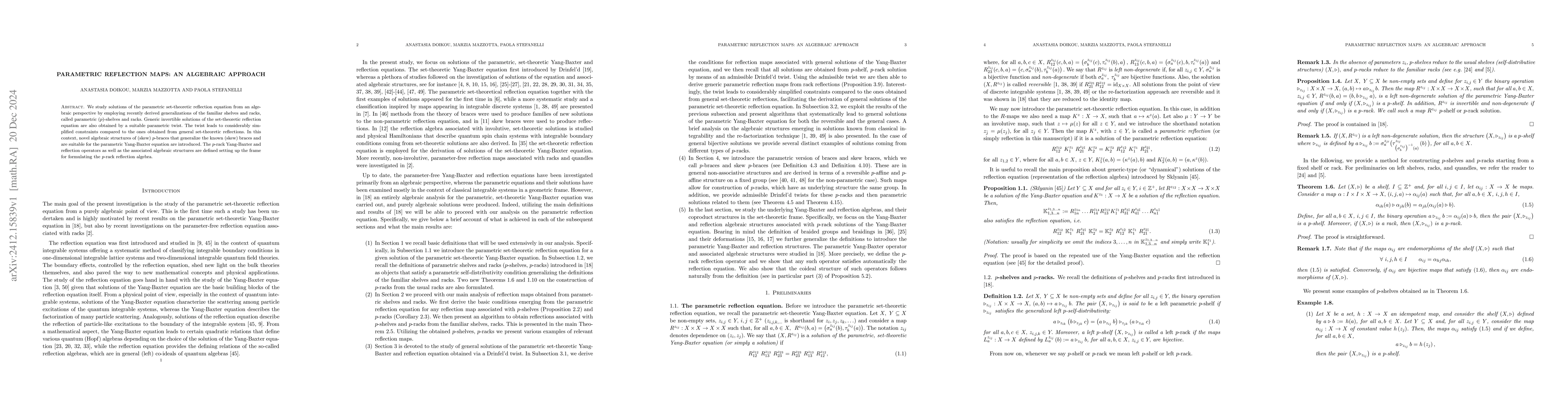 The paper introduces parametric (p)-shelves and racks, and novel (skew) p-braces, extending existing algebraic tools for studying set-theoretic reflection equations.