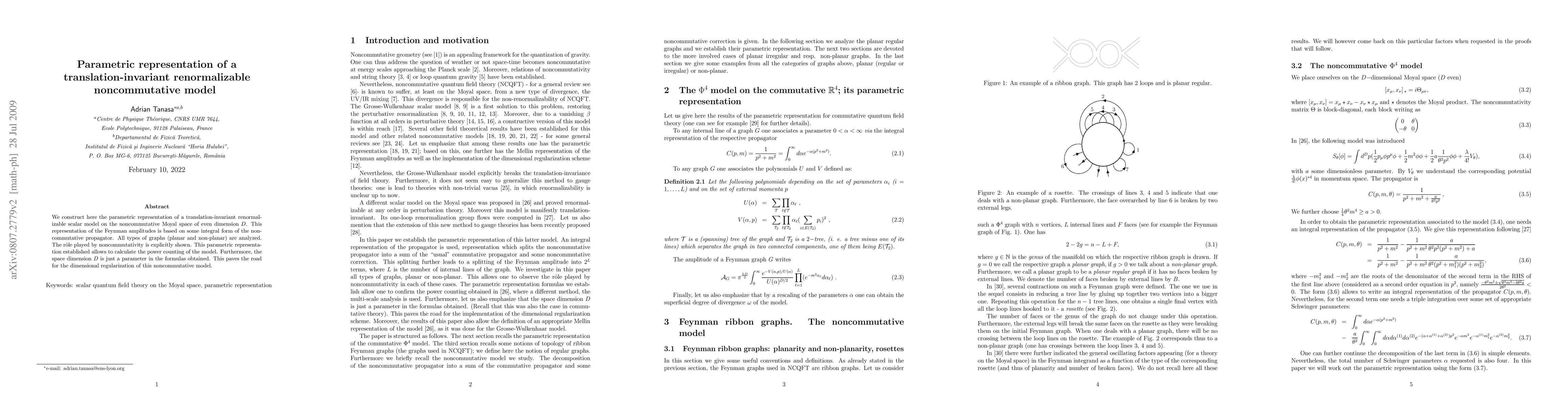 This paper constructs a parametric representation for a translation-invariant renormalizable scalar model on noncommutative Moyal space, analyzing both planar and non-planar Feynman graphs. The representation facilitates power counting and dimensional regularization, treating space dimension as a parameter.