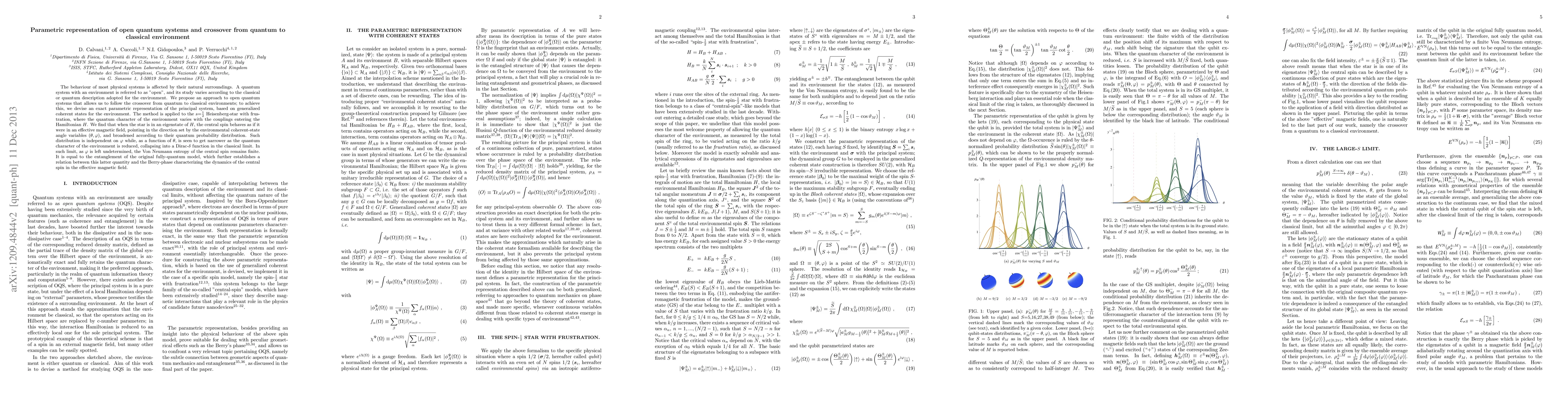 We propose an approach to the study of open quantum systems based on a parametric representation of the principal system. The representation is obtained introducing generalized coherent states for the environment, and is such that the evolution from a fully quantum environment to a classical one can be inherently followed. The method is applied to the specific case where the principal system is a central qubit and the environment is a surrounding ring of interacting spins, with the overall Hamiltonian being that of the $s=1/2$ Heisenberg star with frustration. In this case the quantum character of the environment, embodied by the total spin $S$ of the ring, can be physically varied by acting on the ratio between the couplings entering the Hamiltonian, and formally followed by increasing $S$. We find that when the star is in any of its eigenstates, the qubit behaves as if it were under the effect of an external magnetic field, whose direction in real space is set by the variables defining the environmental coherent states, and is hence broadened according to their quantum probability distribution. When the quantum character of the environment is reduced, such distribution becomes narrower, finally collapsing into a Dirac-$\delta$ as $S\to\infty$. The entanglement between the central qubit and its environment remains well defined even in this limit, where it comes across as the binary entropy of the $2\pi$-normalized Berry phase characterizing the dynamics of a qubit in an adiabatically precessing magnetic field.