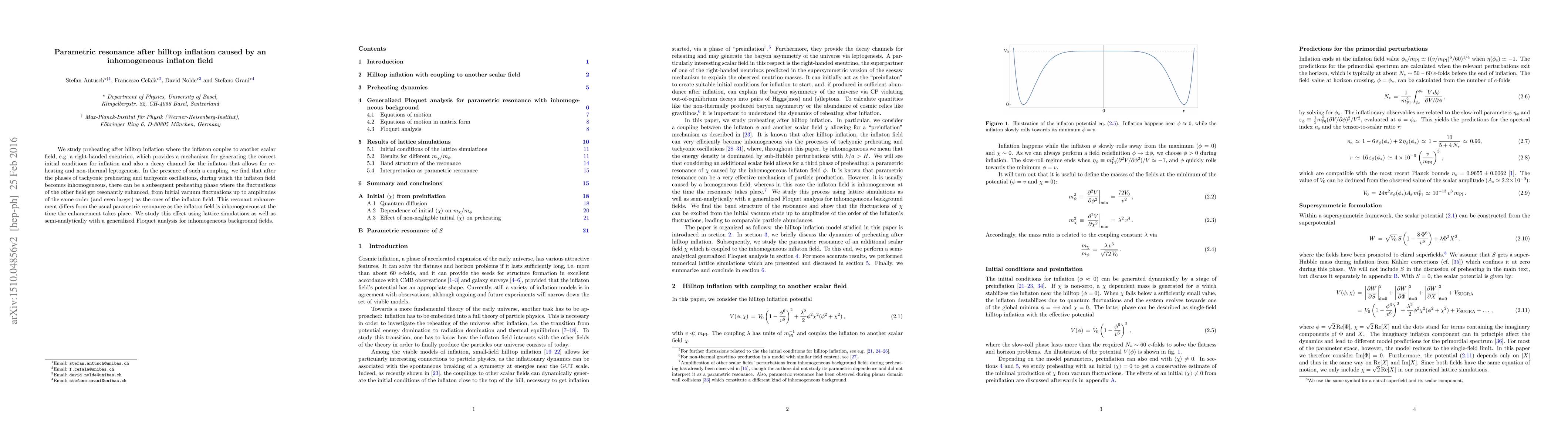 We study preheating after hilltop inflation where the inflaton couples to another scalar field, e.g. a right-handed sneutrino, which provides a mechanism for generating the correct initial conditions for inflation and also a decay channel for the inflaton that allows for reheating and non-thermal leptogenesis. In the presence of such a coupling, we find that after the phases of tachyonic preheating and tachyonic oscillations, during which the inflaton field becomes inhomogeneous, there can be a subsequent preheating phase where the fluctuations of the other field get resonantly enhanced, from initial vacuum fluctuations up to amplitudes of the same order (and even larger) as the ones of the inflaton field. This resonant enhancement differs from the usual parametric resonance as the inflaton field is inhomogeneous at the time the enhancement takes place. We study this effect using lattice simulations as well as semi-analytically with a generalized Floquet analysis for inhomogeneous background fields.