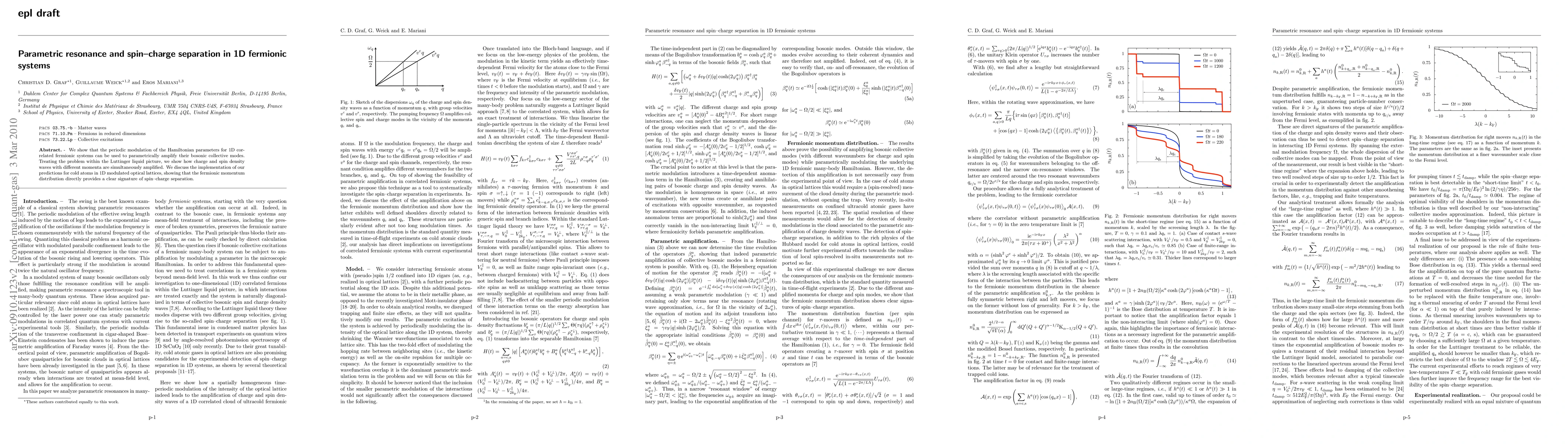 This paper demonstrates that periodic modulation of Hamiltonian parameters in 1D fermionic systems can amplify bosonic collective modes, leading to simultaneous amplification of charge and spin density waves. The findings suggest a clear signature of spin-charge separation observable in cold atoms within modulated optical lattices.