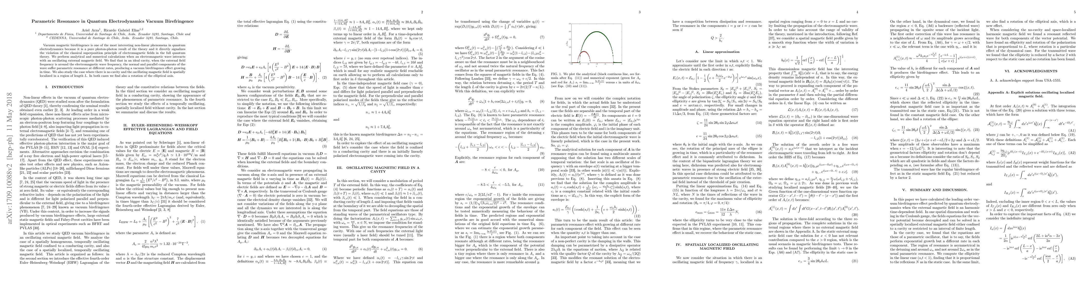 This paper investigates vacuum magnetic birefringence in quantum electrodynamics, demonstrating that an electromagnetic wave interacting with an oscillating external magnetic field exhibits parametric resonance, leading to a growing vacuum birefringence effect. Both cavity and spatially localized magnetic field scenarios are analyzed, with both showing a rotation of the elliptical axis.