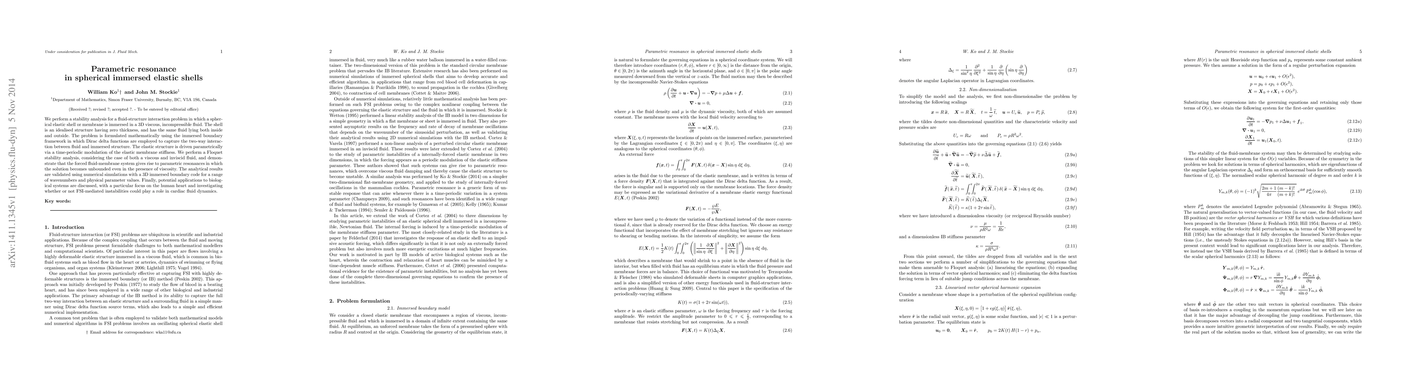 This paper investigates parametric resonance in spherical elastic shells immersed in a viscous fluid, employing a Floquet stability analysis to demonstrate unbounded solutions due to parametric resonances, even with viscosity. Numerical simulations validate the analytical results, and potential applications to biological systems, such as the human heart, are explored.