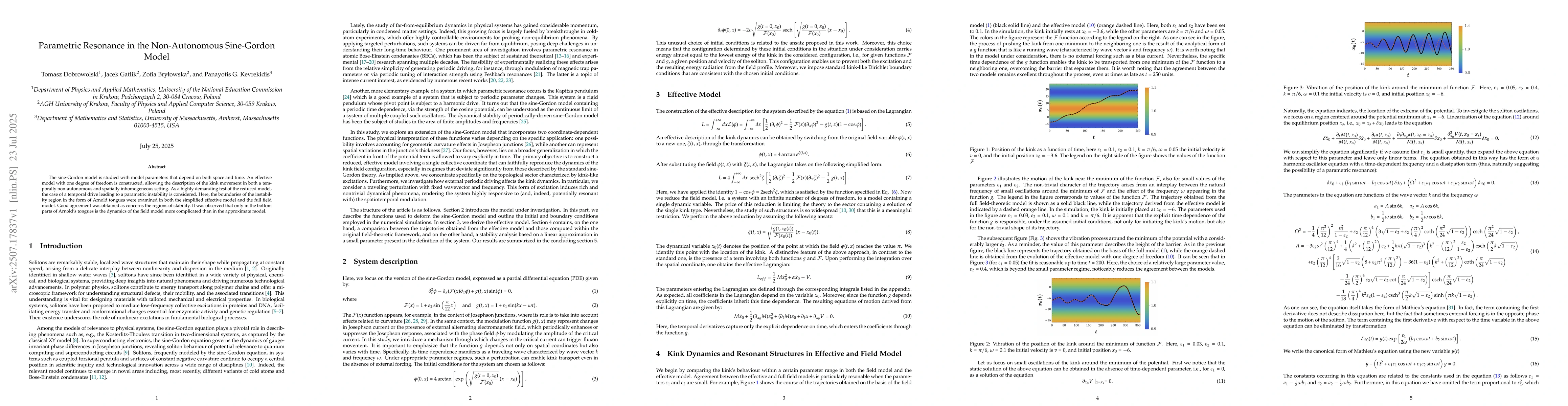 The sine-Gordon model is studied with model parameters that depend on both space and time. An effective model with one degree of freedom is constructed, allowing the description of the kink movement in both a temporally non-autonomous and spatially inhomogeneous setting. As a highly demanding test of the reduced model, the case of a temporal drive leading to a parametric instability is considered. Here, the boundaries of the instability region in the form of Arnold tongues were examined in both the simplified effective model and the full field model. Good agreement was obtained as concerns the regions of stability. It was observed that only in the bottom parts of Arnold's tongues is the dynamics of the field model more complicated than in the approximate model.