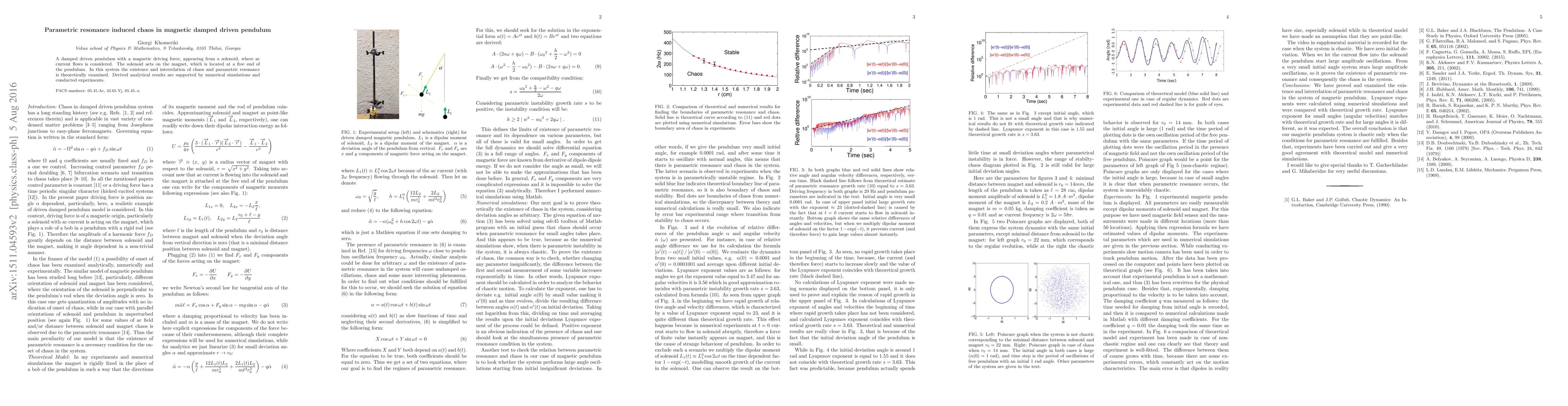 This research investigates the chaotic dynamics in a magnetically driven damped pendulum where parametric resonance is induced. Analytical, numerical, and experimental results reveal the complex interplay between chaos and parametric resonance in this system.