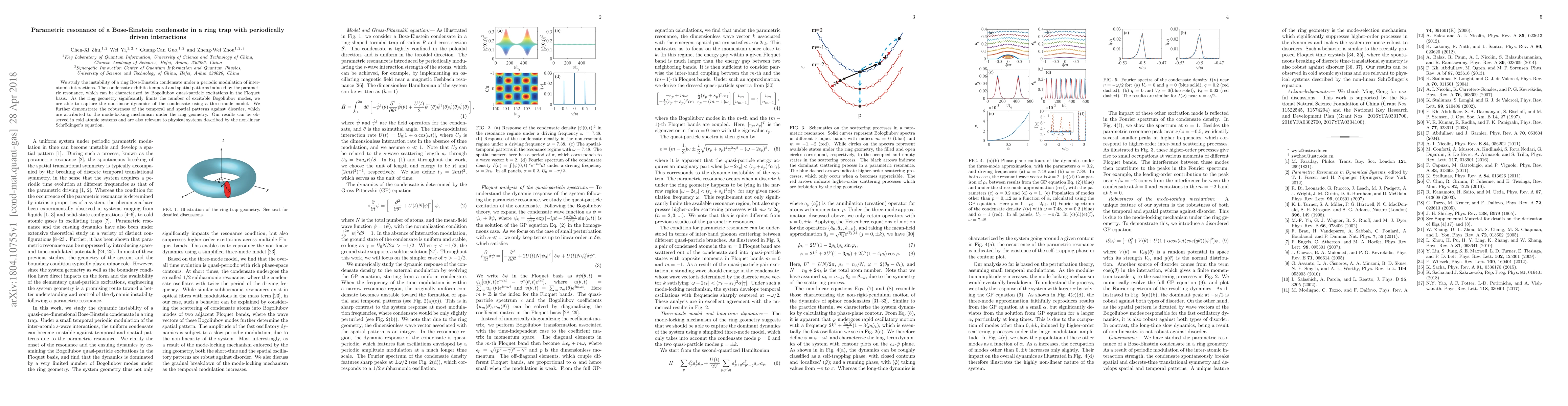 We study the instability of a ring Bose-Einstein condensate under a periodic modulation of inter-atomic interactions. The condensate exhibits temporal and spatial patterns induced by the parametric resonance, which can be characterized by Bogoliubov quasi-particle excitations in the Floquet basis. As the ring geometry significantly limits the number of excitable Bogoliubov modes, we are able to capture the non-linear dynamics of the condensate using a three-mode model. We further demonstrate the robustness of the temporal and spatial patterns against disorder, which are attributed to the mode-locking mechanism under the ring geometry. Our results can be observed in cold atomic systems and are also relevant to physical systems described by the non-linear Schrodinger's equation.