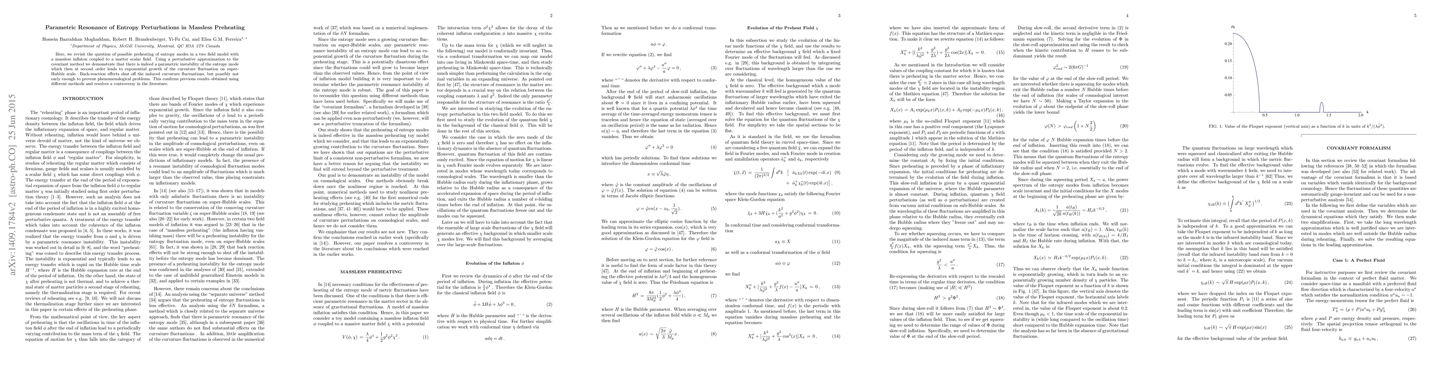 Here, we revisit the question of possible preheating of entropy modes in a two field model with a massless inflaton coupled to a matter scalar field. Using a perturbative approximation to the covariant method we demonstrate that there is indeed a parametric instability of the entropy mode which then at second order leads to exponential growth of the curvature fluctuation on super-Hubble scale. Back-reaction effects shut off the induced curvature fluctuations, but possibly not early enough to prevent phenomenological problems. This confirms previous results obtained using different methods and resolves a controversy in the literature.