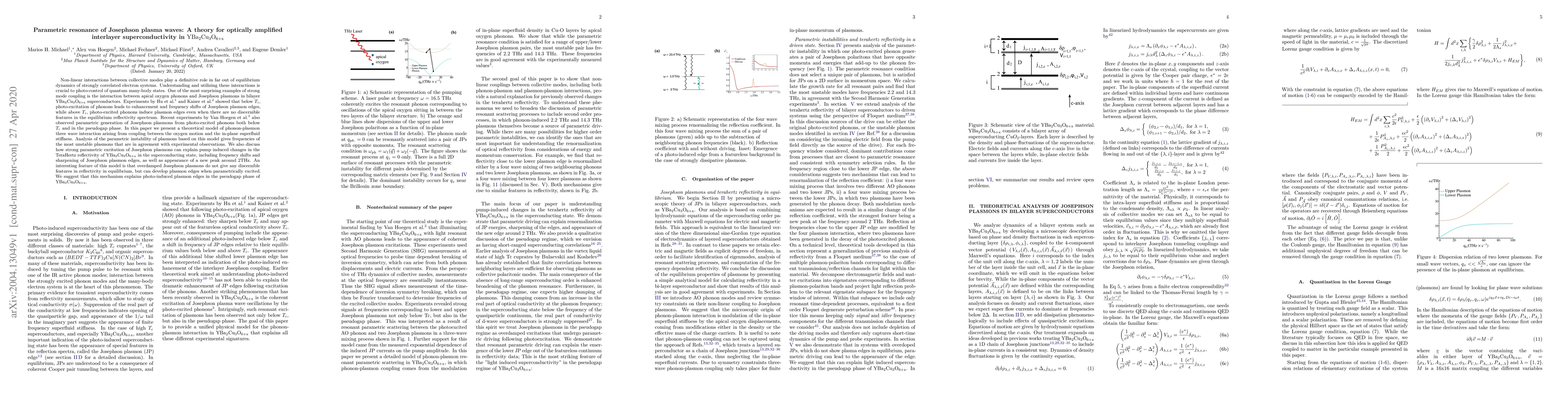 Theoretical model predicts that photo-excitation of phonons in YBa$_2$Cu$_3$O$_{6+x}$ superconductors generates parametrically unstable Josephson plasmons, explaining observed frequency shifts and sharpening of plasmon edges.