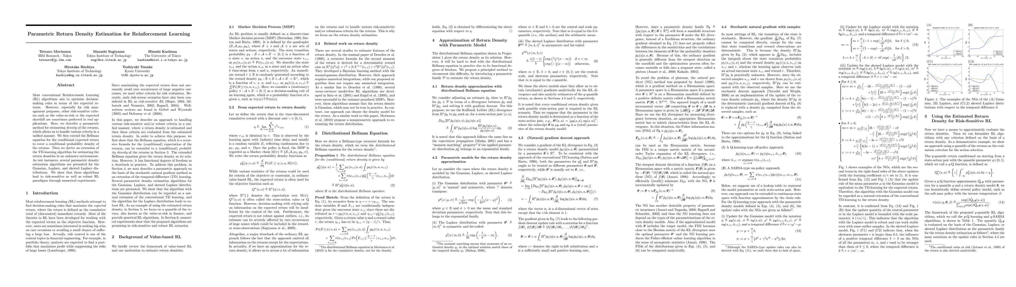 Researchers developed a parametric method to estimate return density in reinforcement learning, enabling handling of risk-sensitive criteria like value-at-risk and expected shortfall. This allows for unified risk management and robust RL paradigms with various distributions.