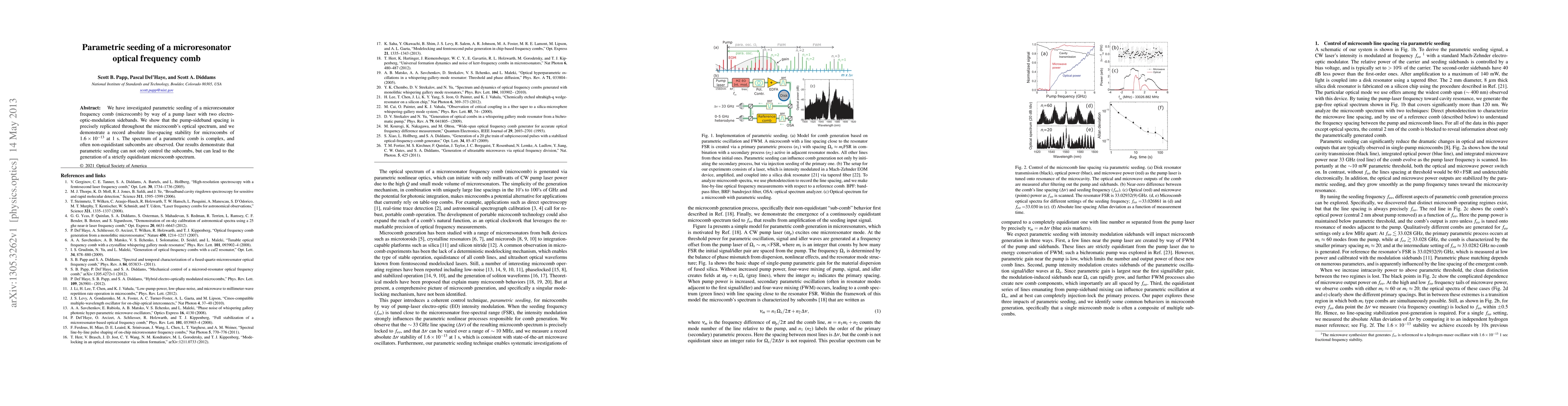 We have investigated parametric seeding of a microresonator frequency comb (microcomb) by way of a pump laser with two electro-optic-modulation sidebands. We show that the pump-sideband spacing is precisely replicated throughout the microcomb's optical spectrum, and we demonstrate a record absolute line-spacing stability for microcombs of $1.6\times10^{-13}$ at 1 s. The spectrum of a parametric comb is complex, and often non-equidistant subcombs are observed. Our results demonstrate that parametric seeding can not only control the subcombs, but can lead to the generation of a strictly equidistant microcomb spectrum.