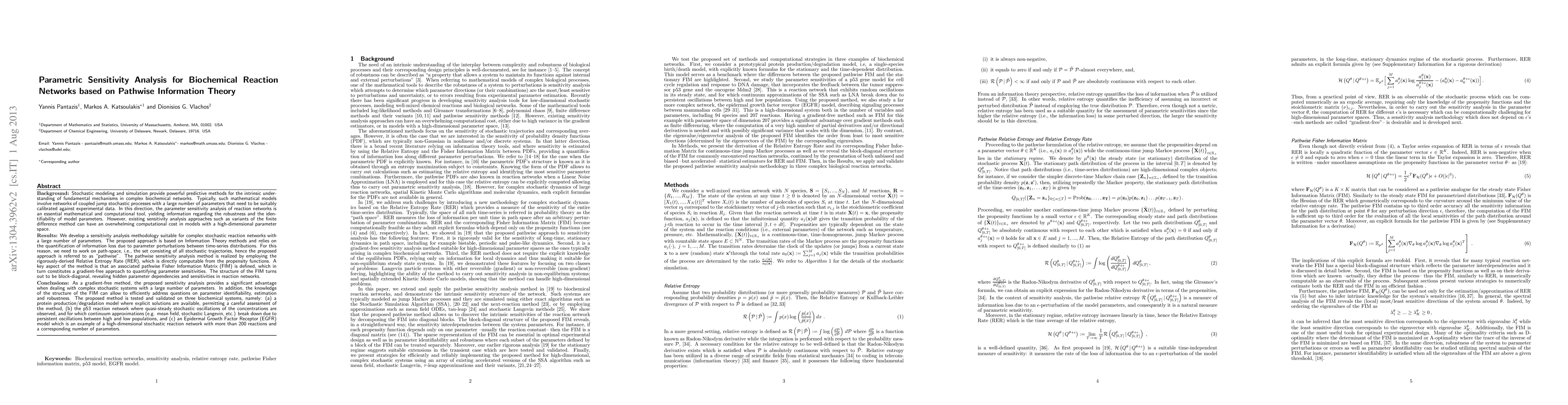 This paper develops a novel pathwise sensitivity analysis methodology for complex biochemical reaction networks using Information Theory. The proposed approach leverages the Relative Entropy Rate and a pathwise Fisher Information Matrix to efficiently quantify parameter sensitivities without relying on gradient computations, thus addressing the high computational cost of traditional methods.