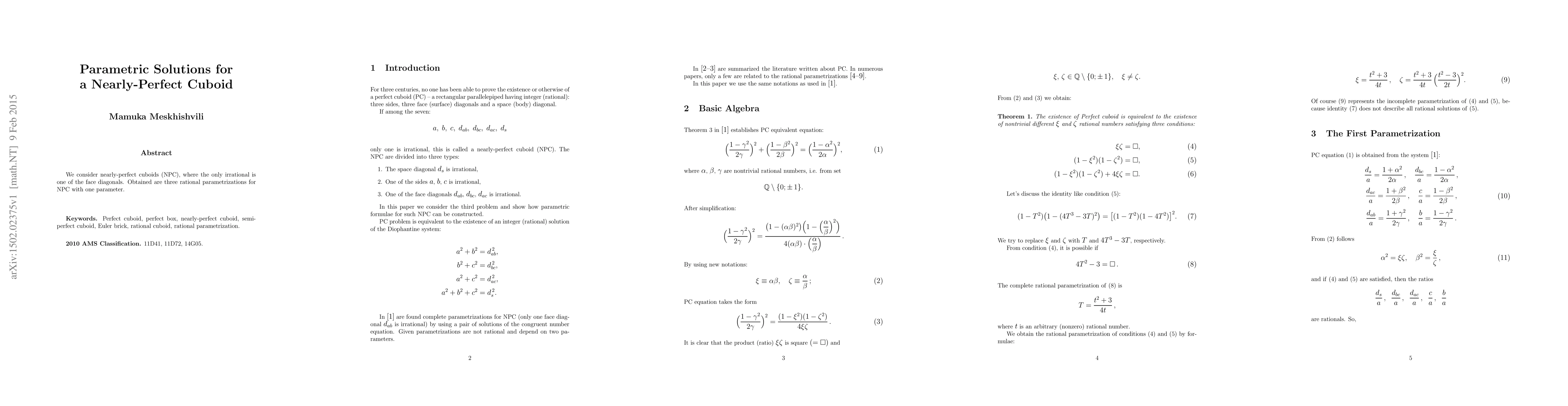 We consider nearly-perfect cuboids (NPC), where the only irrational is one of the face diagonals. Obtained are three rational parametrizations for NPC with one parameter.
