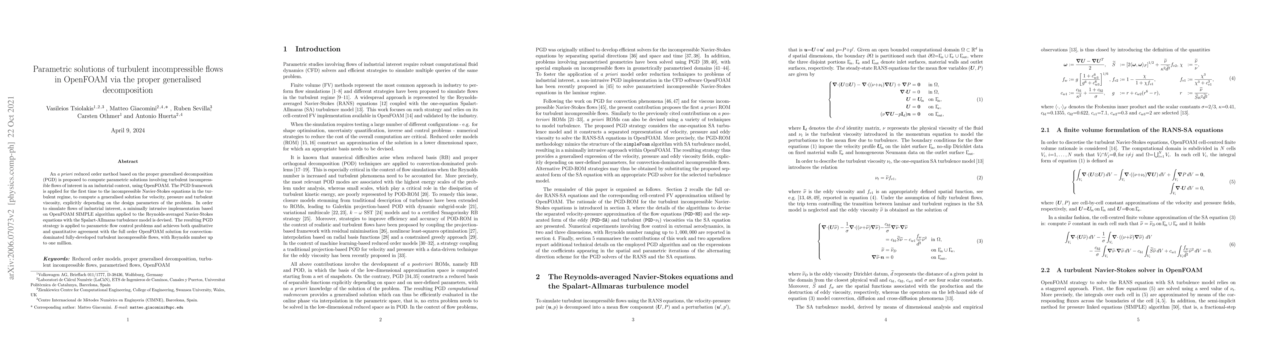This paper proposes a reduced order method using proper generalised decomposition (PGD) to compute parametric solutions for turbulent incompressible flows in OpenFOAM. The PGD framework is applied to the incompressible Navier-Stokes equations in the turbulent regime, achieving a generalised solution for velocity, pressure, and turbulent viscosity dependent on design parameters, and demonstrating agreement with full-order simulations for industrial flows.